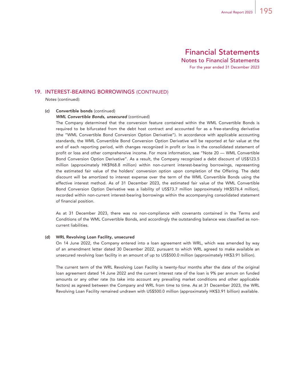 195Annual Report 2023 Financial Statements Notes to Financial Statements For the year ended 31 December 2023 19. INTEREST-BEARING BORROWINGS (CONTINUED) Notes (continued): (c) Convertible bonds (continued) WML Convertible Bonds, unsecured (continued) The Company determined that the conversion feature contained within the WML Convertible Bonds is required to be bifurcated from the debt host contract and accounted for as a free-standing derivative (the “WML Convertible Bond Conversion Option Derivative”). In accordance with applicable accounting standards, the WML Convertible Bond Conversion Option Derivative will be reported at fair value at the end of each reporting period, with changes recognized in profit or loss in the consolidated statement of profit or loss and other comprehensive income. For more information, see “Note 20 — WML Convertible Bond Conversion Option Derivative”. As a result, the Company recognized a debt discount of US$123.5 million (approximately HK$968.8 million) within non-current interest-bearing borrowings, representing the estimated fair value of the holders’ conversion option upon completion of the Offering. The debt discount will be amortized to interest expense over the term of the WML Convertible Bonds using the effective interest method. As of 31 December 2023, the estimated fair value of the WML Convertible Bond Conversion Option Derivative was a liability of US$73.7 million (approximately HK$576.4 million), recorded within non-current interest-bearing borrowings within the accompanying consolidated statement of financial position. As at 31 December 2023, there was no non-compliance with covenants contained in the Terms and Conditions of the WML Convertible Bonds, and accordingly the outstanding balance was classified as non- current liabilities. (d) WRL Revolving Loan Facility, unsecured On 14 June 2022, the Company entered into a loan agreement with WRL, which was amended by way of an amendment letter dated 30 December 2022, pursuant to which WRL agreed to make available an unsecured revolving loan facility in an amount of up to US$500.0 million (approximately HK$3.91 billion). The current term of the WRL Revolving Loan Facility is twenty-four months after the date of the original loan agreement dated 14 June 2022 and the current interest rate of the loan is 9% per annum on funded amounts or any other rate (to take into account any prevailing market conditions and other applicable factors) as agreed between the Company and WRL from time to time. As at 31 December 2023, the WRL Revolving Loan Facility remained undrawn with US$500.0 million (approximately HK$3.91 billion) available.