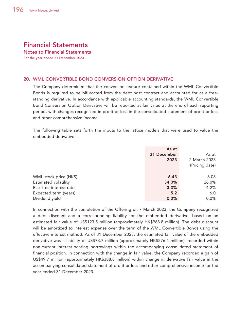 196 Wynn Macau, Limited Financial Statements Notes to Financial Statements For the year ended 31 December 2023 20. WML CONVERTIBLE BOND CONVERSION OPTION DERIVATIVE The Company determined that the conversion feature contained within the WML Convertible Bonds is required to be bifurcated from the debt host contract and accounted for as a free- standing derivative. In accordance with applicable accounting standards, the WML Convertible Bond Conversion Option Derivative will be reported at fair value at the end of each reporting period, with changes recognized in profit or loss in the consolidated statement of profit or loss and other comprehensive income. The following table sets forth the inputs to the lattice models that were used to value the embedded derivative: As at 31 December 2023 As at 2 March 2023 (Pricing date) WML stock price (HK$) 6.43 8.08 Estimated volatility 34.0% 26.0% Risk-free interest rate 3.3% 4.2% Expected term (years) 5.2 6.0 Dividend yield 0.0% 0.0% In connection with the completion of the Offering on 7 March 2023, the Company recognized a debt discount and a corresponding liability for the embedded derivative, based on an estimated fair value of US$123.5 million (approximately HK$968.8 million). The debt discount will be amortized to interest expense over the term of the WML Convertible Bonds using the effective interest method. As of 31 December 2023, the estimated fair value of the embedded derivative was a liability of US$73.7 million (approximately HK$576.4 million), recorded within non-current interest-bearing borrowings within the accompanying consolidated statement of financial position. In connection with the change in fair value, the Company recorded a gain of US$49.7 million (approximately HK$388.8 million) within change in derivative fair value in the accompanying consolidated statement of profit or loss and other comprehensive income for the year ended 31 December 2023.