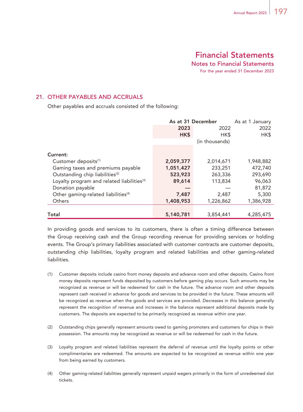 197Annual Report 2023 Financial Statements Notes to Financial Statements For the year ended 31 December 2023 21. OTHER PAYABLES AND ACCRUALS Other payables and accruals consisted of the following: As at 31 December As at 1 January 2023 2022 2022 HK$ HK$ HK$ (in thousands) Current: Customer deposits(1) 2,059,377 2,014,671 1,948,882 Gaming taxes and premiums payable 1,051,427 233,251 472,740 Outstanding chip liabilities(2) 523,923 263,336 293,690 Loyalty program and related liabilities(3) 89,614 113,834 96,063 Donation payable — — 81,872 Other gaming-related liabilities(4) 7,487 2,487 5,300 Others 1,408,953 1,226,862 1,386,928 Total 5,140,781 3,854,441 4,285,475 In providing goods and services to its customers, there is often a timing difference between the Group receiving cash and the Group recording revenue for providing services or holding events. The Group’s primary liabilities associated with customer contracts are customer deposits, outstanding chip liabilities, loyalty program and related liabilities and other gaming-related liabilities. (1) Customer deposits include casino front money deposits and advance room and other deposits. Casino front money deposits represent funds deposited by customers before gaming play occurs. Such amounts may be recognized as revenue or will be redeemed for cash in the future. The advance room and other deposits represent cash received in advance for goods and services to be provided in the future. These amounts will be recognized as revenue when the goods and services are provided. Decreases in this balance generally represent the recognition of revenue and increases in the balance represent additional deposits made by customers. The deposits are expected to be primarily recognized as revenue within one year. (2) Outstanding chips generally represent amounts owed to gaming promoters and customers for chips in their possession. The amounts may be recognized as revenue or will be redeemed for cash in the future. (3) Loyalty program and related liabilities represent the deferral of revenue until the loyalty points or other complimentaries are redeemed. The amounts are expected to be recognized as revenue within one year from being earned by customers. (4) Other gaming-related liabilities generally represent unpaid wagers primarily in the form of unredeemed slot tickets.