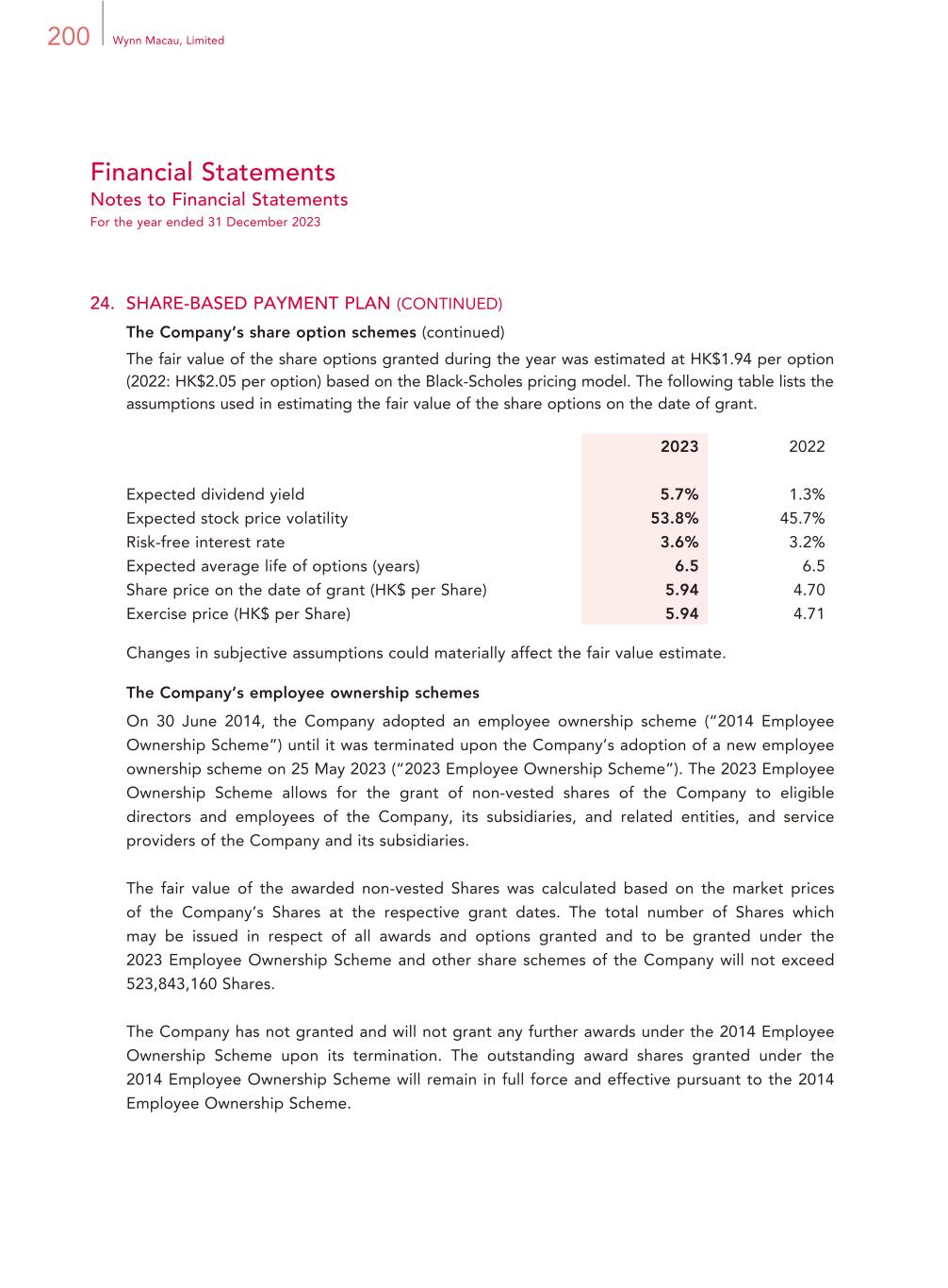 200 Wynn Macau, Limited Financial Statements Notes to Financial Statements For the year ended 31 December 2023 24. SHARE-BASED PAYMENT PLAN (CONTINUED) The Company’s share option schemes (continued) The fair value of the share options granted during the year was estimated at HK$1.94 per option (2022: HK$2.05 per option) based on the Black-Scholes pricing model. The following table lists the assumptions used in estimating the fair value of the share options on the date of grant. 2023 2022 Expected dividend yield 5.7% 1.3% Expected stock price volatility 53.8% 45.7% Risk-free interest rate 3.6% 3.2% Expected average life of options (years) 6.5 6.5 Share price on the date of grant (HK$ per Share) 5.94 4.70 Exercise price (HK$ per Share) 5.94 4.71 Changes in subjective assumptions could materially affect the fair value estimate. The Company’s employee ownership schemes On 30 June 2014, the Company adopted an employee ownership scheme (“2014 Employee Ownership Scheme”) until it was terminated upon the Company’s adoption of a new employee ownership scheme on 25 May 2023 (“2023 Employee Ownership Scheme”). The 2023 Employee Ownership Scheme allows for the grant of non-vested shares of the Company to eligible directors and employees of the Company, its subsidiaries, and related entities, and service providers of the Company and its subsidiaries. The fair value of the awarded non-vested Shares was calculated based on the market prices of the Company’s Shares at the respective grant dates. The total number of Shares which may be issued in respect of all awards and options granted and to be granted under the 2023 Employee Ownership Scheme and other share schemes of the Company will not exceed 523,843,160 Shares. The Company has not granted and will not grant any further awards under the 2014 Employee Ownership Scheme upon its termination. The outstanding award shares granted under the 2014 Employee Ownership Scheme will remain in full force and effective pursuant to the 2014 Employee Ownership Scheme.