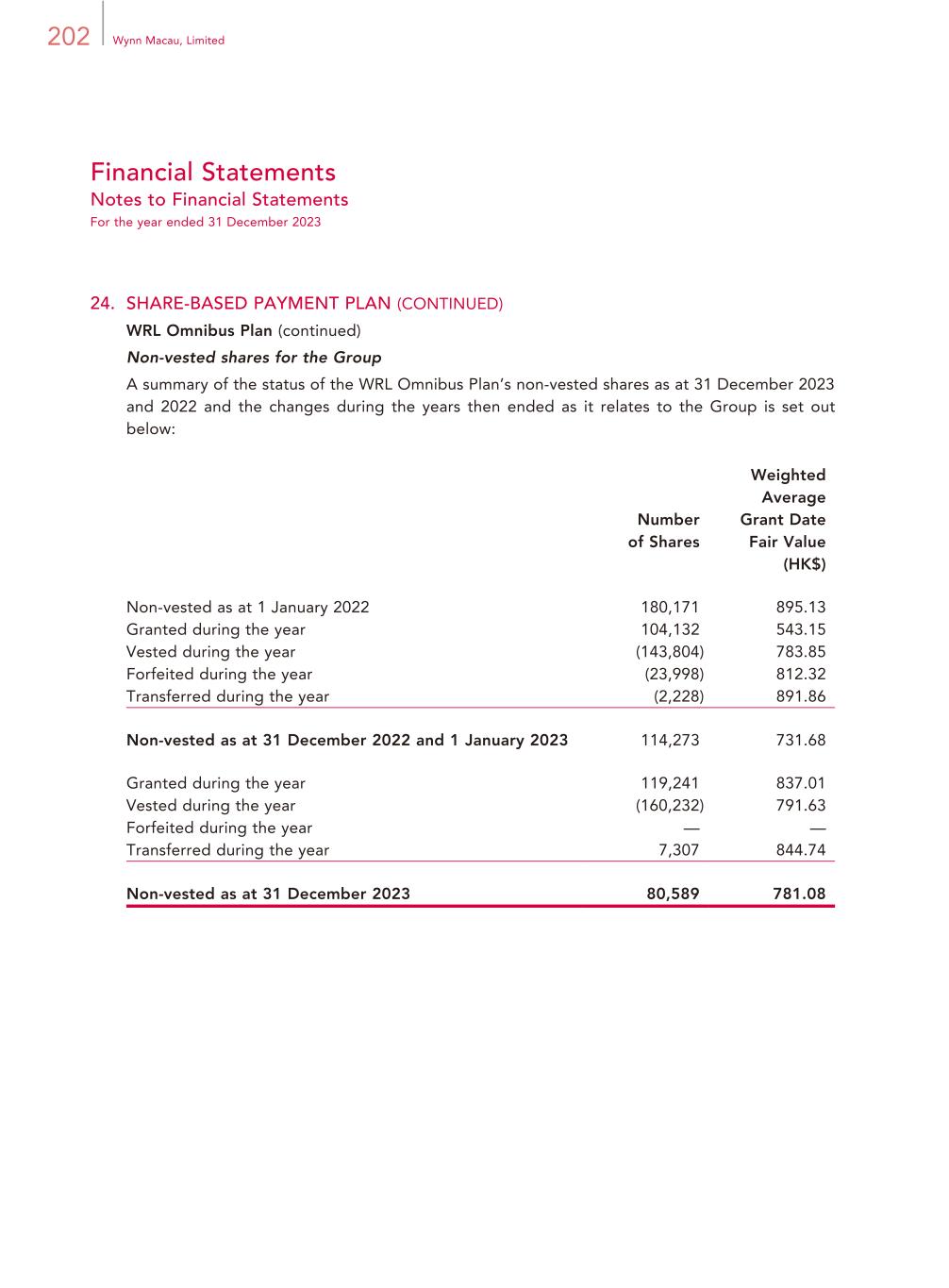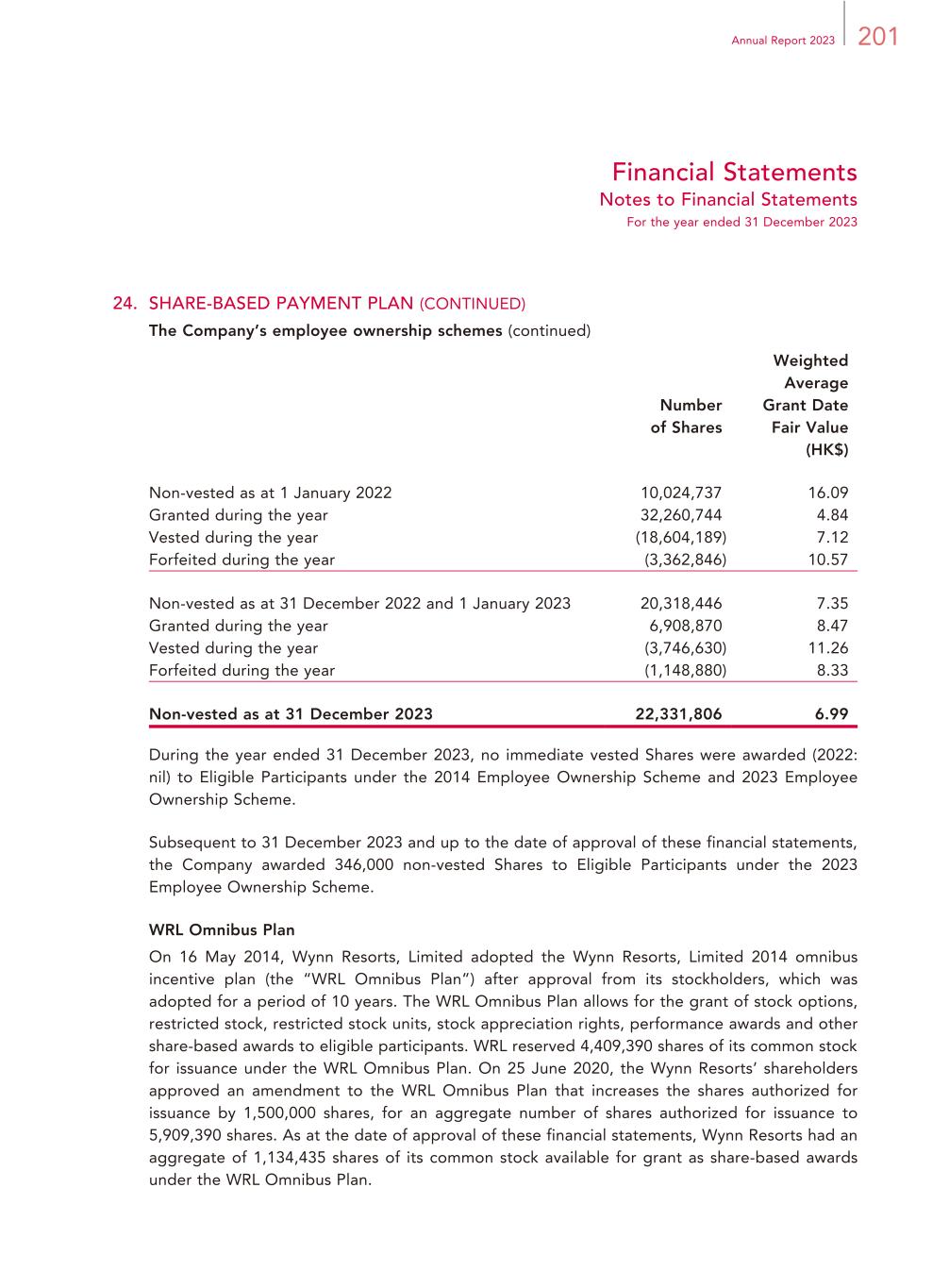 201Annual Report 2023 Financial Statements Notes to Financial Statements For the year ended 31 December 2023 24. SHARE-BASED PAYMENT PLAN (CONTINUED) The Company’s employee ownership schemes (continued) Number of Shares Weighted Average Grant Date Fair Value (HK$) Non-vested as at 1 January 2022 10,024,737 16.09 Granted during the year 32,260,744 4.84 Vested during the year (18,604,189) 7.12 Forfeited during the year (3,362,846) 10.57 Non-vested as at 31 December 2022 and 1 January 2023 20,318,446 7.35 Granted during the year 6,908,870 8.47 Vested during the year (3,746,630) 11.26 Forfeited during the year (1,148,880) 8.33 Non-vested as at 31 December 2023 22,331,806 6.99 During the year ended 31 December 2023, no immediate vested Shares were awarded (2022: nil) to Eligible Participants under the 2014 Employee Ownership Scheme and 2023 Employee Ownership Scheme. Subsequent to 31 December 2023 and up to the date of approval of these financial statements, the Company awarded 346,000 non-vested Shares to Eligible Participants under the 2023 Employee Ownership Scheme. WRL Omnibus Plan On 16 May 2014, Wynn Resorts, Limited adopted the Wynn Resorts, Limited 2014 omnibus incentive plan (the “WRL Omnibus Plan”) after approval from its stockholders, which was adopted for a period of 10 years. The WRL Omnibus Plan allows for the grant of stock options, restricted stock, restricted stock units, stock appreciation rights, performance awards and other share-based awards to eligible participants. WRL reserved 4,409,390 shares of its common stock for issuance under the WRL Omnibus Plan. On 25 June 2020, the Wynn Resorts’ shareholders approved an amendment to the WRL Omnibus Plan that increases the shares authorized for issuance by 1,500,000 shares, for an aggregate number of shares authorized for issuance to 5,909,390 shares. As at the date of approval of these financial statements, Wynn Resorts had an aggregate of 1,134,435 shares of its common stock available for grant as share-based awards under the WRL Omnibus Plan.