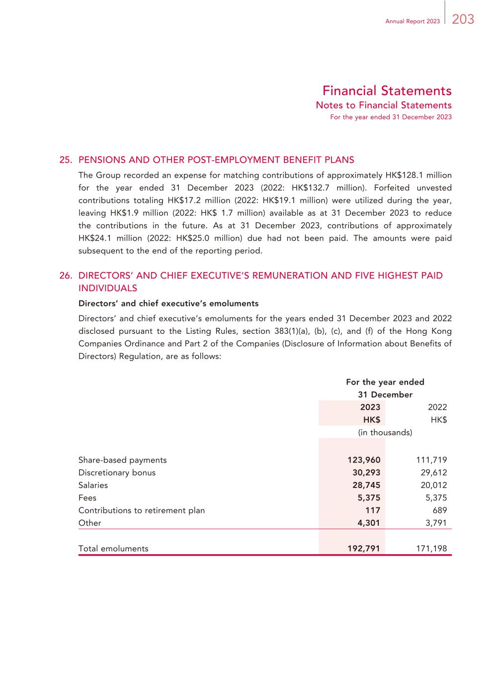 203Annual Report 2023 Financial Statements Notes to Financial Statements For the year ended 31 December 2023 25. PENSIONS AND OTHER POST-EMPLOYMENT BENEFIT PLANS The Group recorded an expense for matching contributions of approximately HK$128.1 million for the year ended 31 December 2023 (2022: HK$132.7 million). Forfeited unvested contributions totaling HK$17.2 million (2022: HK$19.1 million) were utilized during the year, leaving HK$1.9 million (2022: HK$ 1.7 million) available as at 31 December 2023 to reduce the contributions in the future. As at 31 December 2023, contributions of approximately HK$24.1 million (2022: HK$25.0 million) due had not been paid. The amounts were paid subsequent to the end of the reporting period. 26. DIRECTORS’ AND CHIEF EXECUTIVE’S REMUNERATION AND FIVE HIGHEST PAID INDIVIDUALS Directors’ and chief executive’s emoluments Directors’ and chief executive’s emoluments for the years ended 31 December 2023 and 2022 disclosed pursuant to the Listing Rules, section 383(1)(a), (b), (c), and (f) of the Hong Kong Companies Ordinance and Part 2 of the Companies (Disclosure of Information about Benefits of Directors) Regulation, are as follows: For the year ended 31 December 2023 2022 HK$ HK$ (in thousands) Share-based payments 123,960 111,719 Discretionary bonus 30,293 29,612 Salaries 28,745 20,012 Fees 5,375 5,375 Contributions to retirement plan 117 689 Other 4,301 3,791 Total emoluments 192,791 171,198