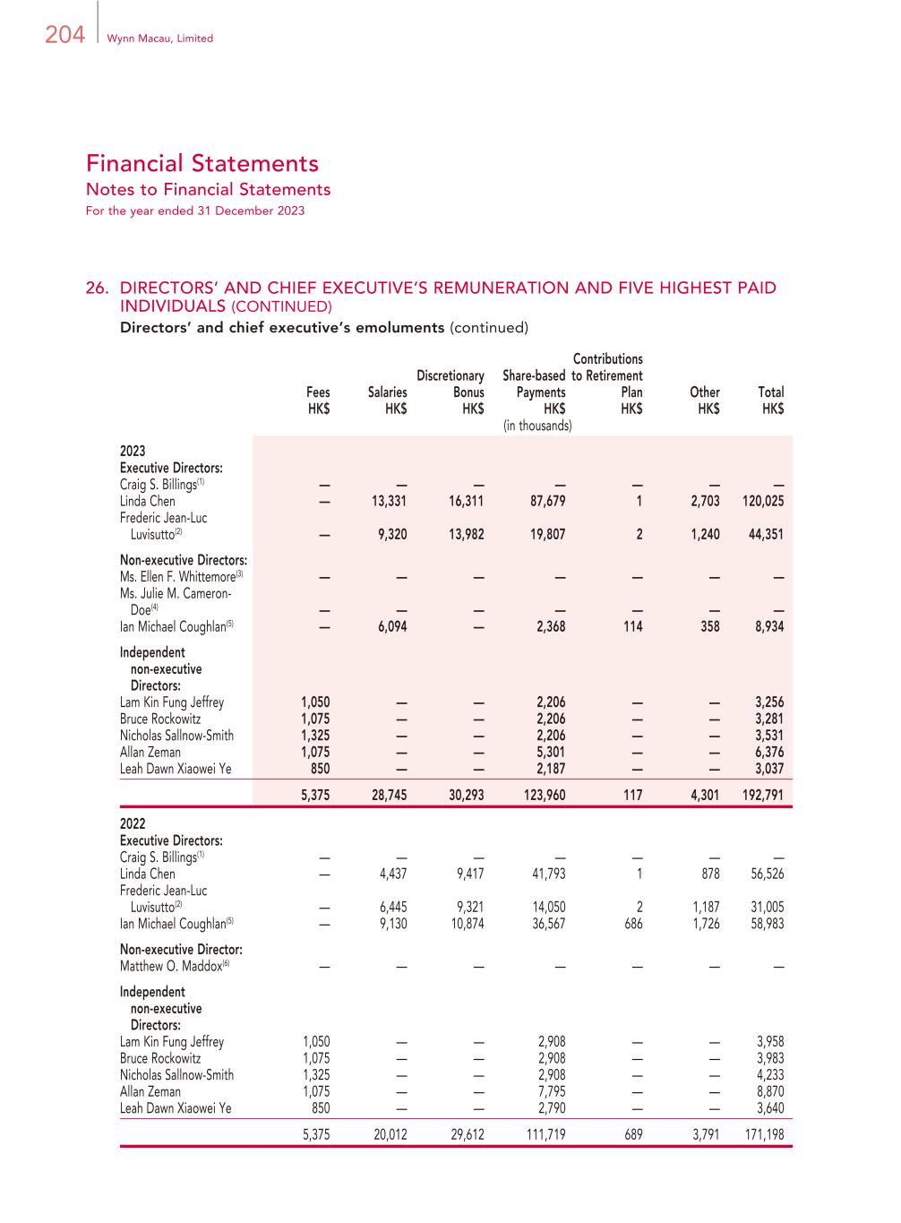 204 Wynn Macau, Limited Financial Statements Notes to Financial Statements For the year ended 31 December 2023 26. DIRECTORS’ AND CHIEF EXECUTIVE’S REMUNERATION AND FIVE HIGHEST PAID INDIVIDUALS (CONTINUED) Directors’ and chief executive’s emoluments (continued) Fees Salaries Discretionary Bonus Share-based Payments Contributions to Retirement Plan Other Total HK$ HK$ HK$ HK$ HK$ HK$ HK$ (in thousands) 2023 Executive Directors: Craig S. Billings(1) — — — — — — — Linda Chen — 13,331 16,311 87,679 1 2,703 120,025 Frederic Jean-Luc Luvisutto(2) — 9,320 13,982 19,807 2 1,240 44,351 Non-executive Directors: Ms. Ellen F. Whittemore(3) — — — — — — — Ms. Julie M. Cameron- Doe(4) — — — — — — — Ian Michael Coughlan(5) — 6,094 — 2,368 114 358 8,934 Independent non-executive Directors: Lam Kin Fung Jeffrey 1,050 — — 2,206 — — 3,256 Bruce Rockowitz 1,075 — — 2,206 — — 3,281 Nicholas Sallnow-Smith 1,325 — — 2,206 — — 3,531 Allan Zeman 1,075 — — 5,301 — — 6,376 Leah Dawn Xiaowei Ye 850 — — 2,187 — — 3,037 5,375 28,745 30,293 123,960 117 4,301 192,791 2022 Executive Directors: Craig S. Billings(1) — — — — — — — Linda Chen — 4,437 9,417 41,793 1 878 56,526 Frederic Jean-Luc Luvisutto(2) — 6,445 9,321 14,050 2 1,187 31,005 Ian Michael Coughlan(5) — 9,130 10,874 36,567 686 1,726 58,983 Non-executive Director: Matthew O. Maddox(6) — — — — — — — Independent non-executive Directors: Lam Kin Fung Jeffrey 1,050 — — 2,908 — — 3,958 Bruce Rockowitz 1,075 — — 2,908 — — 3,983 Nicholas Sallnow-Smith 1,325 — — 2,908 — — 4,233 Allan Zeman 1,075 — — 7,795 — — 8,870 Leah Dawn Xiaowei Ye 850 — — 2,790 — — 3,640 5,375 20,012 29,612 111,719 689 3,791 171,198