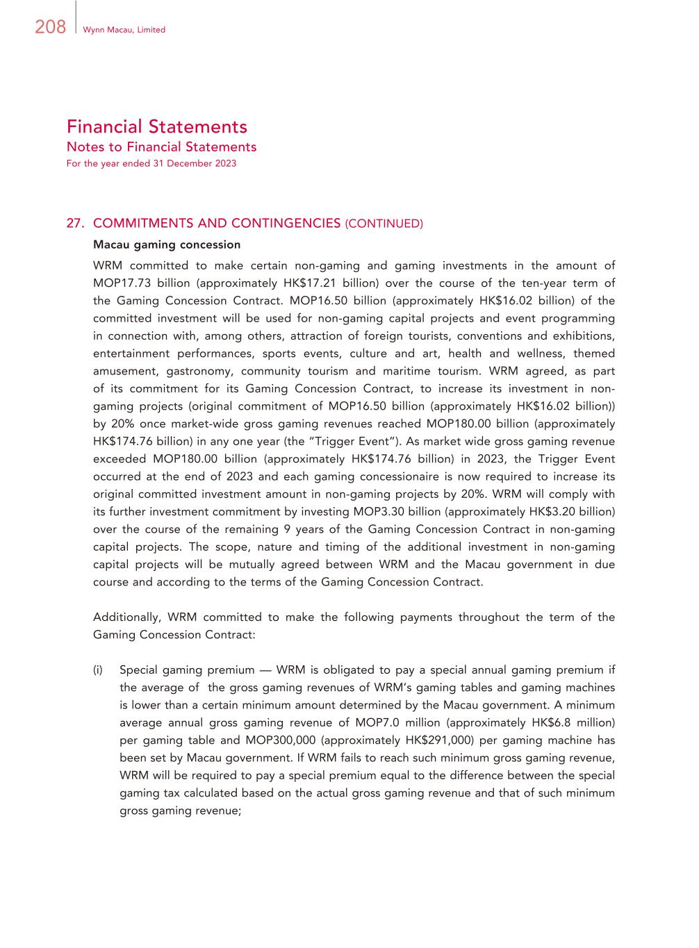 208 Wynn Macau, Limited Financial Statements Notes to Financial Statements For the year ended 31 December 2023 27. COMMITMENTS AND CONTINGENCIES (CONTINUED) Macau gaming concession WRM committed to make certain non-gaming and gaming investments in the amount of MOP17.73 billion (approximately HK$17.21 billion) over the course of the ten-year term of the Gaming Concession Contract. MOP16.50 billion (approximately HK$16.02 billion) of the committed investment will be used for non-gaming capital projects and event programming in connection with, among others, attraction of foreign tourists, conventions and exhibitions, entertainment performances, sports events, culture and art, health and wellness, themed amusement, gastronomy, community tourism and maritime tourism. WRM agreed, as part of its commitment for its Gaming Concession Contract, to increase its investment in non- gaming projects (original commitment of MOP16.50 billion (approximately HK$16.02 billion)) by 20% once market-wide gross gaming revenues reached MOP180.00 billion (approximately HK$174.76 billion) in any one year (the “Trigger Event”). As market wide gross gaming revenue exceeded MOP180.00 billion (approximately HK$174.76 billion) in 2023, the Trigger Event occurred at the end of 2023 and each gaming concessionaire is now required to increase its original committed investment amount in non-gaming projects by 20%. WRM will comply with its further investment commitment by investing MOP3.30 billion (approximately HK$3.20 billion) over the course of the remaining 9 years of the Gaming Concession Contract in non-gaming capital projects. The scope, nature and timing of the additional investment in non-gaming capital projects will be mutually agreed between WRM and the Macau government in due course and according to the terms of the Gaming Concession Contract. Additionally, WRM committed to make the following payments throughout the term of the Gaming Concession Contract: (i) Special gaming premium — WRM is obligated to pay a special annual gaming premium if the average of the gross gaming revenues of WRM’s gaming tables and gaming machines is lower than a certain minimum amount determined by the Macau government. A minimum average annual gross gaming revenue of MOP7.0 million (approximately HK$6.8 million) per gaming table and MOP300,000 (approximately HK$291,000) per gaming machine has been set by Macau government. If WRM fails to reach such minimum gross gaming revenue, WRM will be required to pay a special premium equal to the difference between the special gaming tax calculated based on the actual gross gaming revenue and that of such minimum gross gaming revenue;