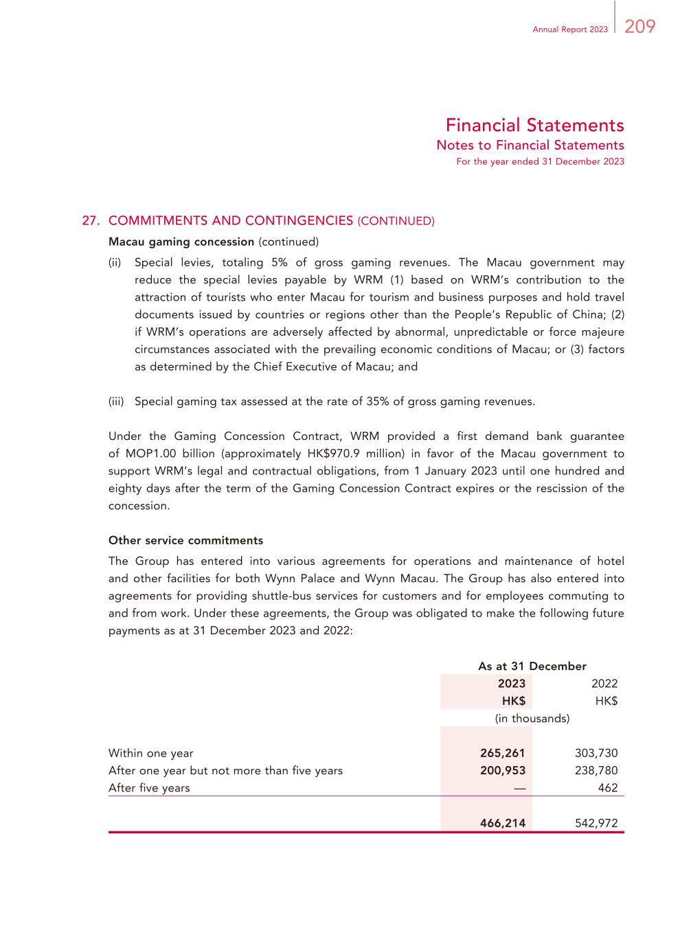 209Annual Report 2023 Financial Statements Notes to Financial Statements For the year ended 31 December 2023 27. COMMITMENTS AND CONTINGENCIES (CONTINUED) Macau gaming concession (continued) (ii) Special levies, totaling 5% of gross gaming revenues. The Macau government may reduce the special levies payable by WRM (1) based on WRM’s contribution to the attraction of tourists who enter Macau for tourism and business purposes and hold travel documents issued by countries or regions other than the People’s Republic of China; (2) if WRM’s operations are adversely affected by abnormal, unpredictable or force majeure circumstances associated with the prevailing economic conditions of Macau; or (3) factors as determined by the Chief Executive of Macau; and (iii) Special gaming tax assessed at the rate of 35% of gross gaming revenues. Under the Gaming Concession Contract, WRM provided a first demand bank guarantee of MOP1.00 billion (approximately HK$970.9 million) in favor of the Macau government to support WRM’s legal and contractual obligations, from 1 January 2023 until one hundred and eighty days after the term of the Gaming Concession Contract expires or the rescission of the concession. Other service commitments The Group has entered into various agreements for operations and maintenance of hotel and other facilities for both Wynn Palace and Wynn Macau. The Group has also entered into agreements for providing shuttle-bus services for customers and for employees commuting to and from work. Under these agreements, the Group was obligated to make the following future payments as at 31 December 2023 and 2022: As at 31 December 2023 2022 HK$ HK$ (in thousands) Within one year 265,261 303,730 After one year but not more than five years 200,953 238,780 After five years — 462 466,214 542,972