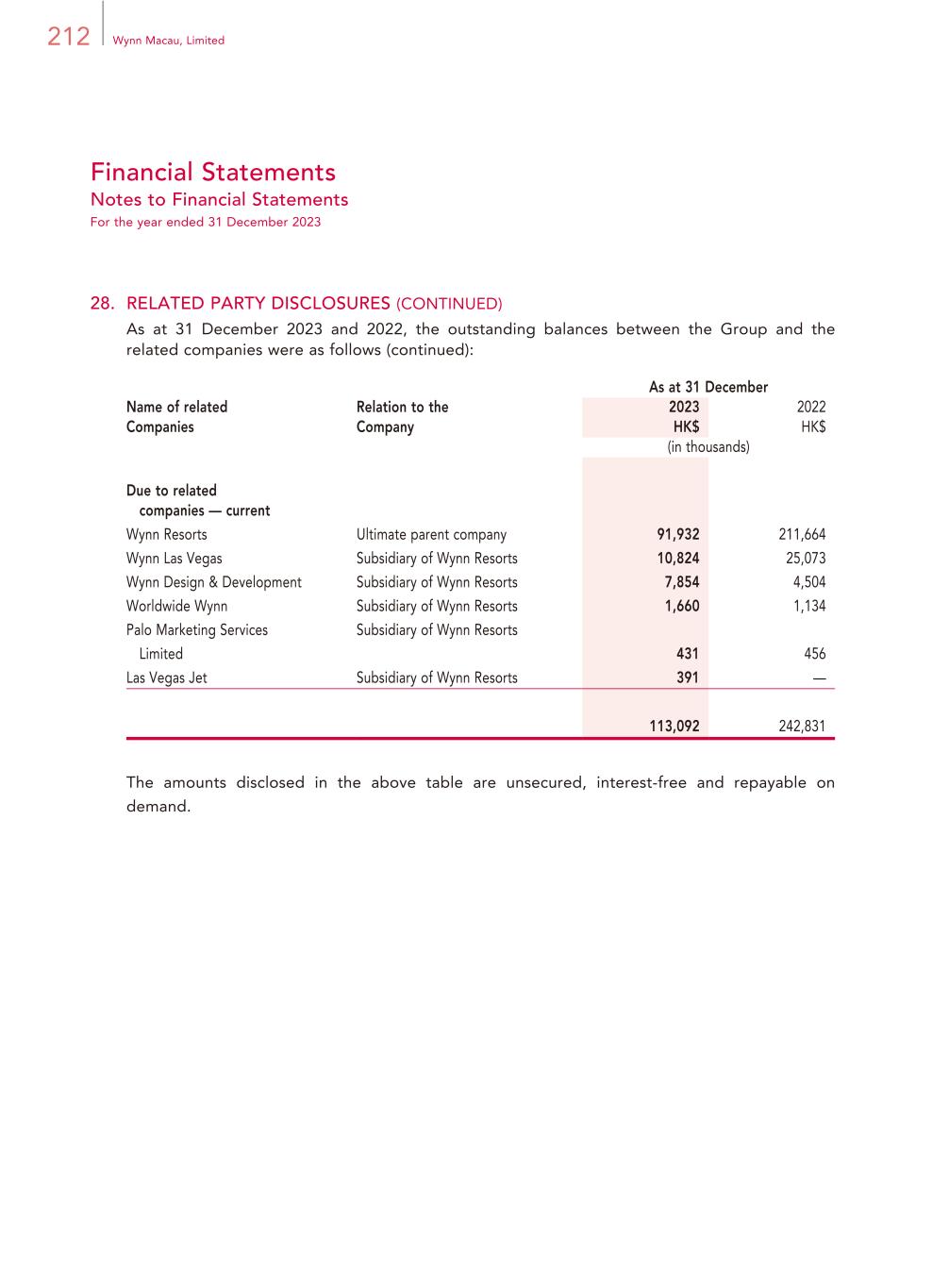 212 Wynn Macau, Limited Financial Statements Notes to Financial Statements For the year ended 31 December 2023 28. RELATED PARTY DISCLOSURES (CONTINUED) As at 31 December 2023 and 2022, the outstanding balances between the Group and the related companies were as follows (continued): As at 31 December Name of related Companies Relation to the Company 2023 2022 HK$ HK$ (in thousands) Due to related companies — current Wynn Resorts Ultimate parent company 91,932 211,664 Wynn Las Vegas Subsidiary of Wynn Resorts 10,824 25,073 Wynn Design & Development Subsidiary of Wynn Resorts 7,854 4,504 Worldwide Wynn Subsidiary of Wynn Resorts 1,660 1,134 Palo Marketing Services Limited Subsidiary of Wynn Resorts 431 456 Las Vegas Jet Subsidiary of Wynn Resorts 391 — 113,092 242,831 The amounts disclosed in the above table are unsecured, interest-free and repayable on demand.