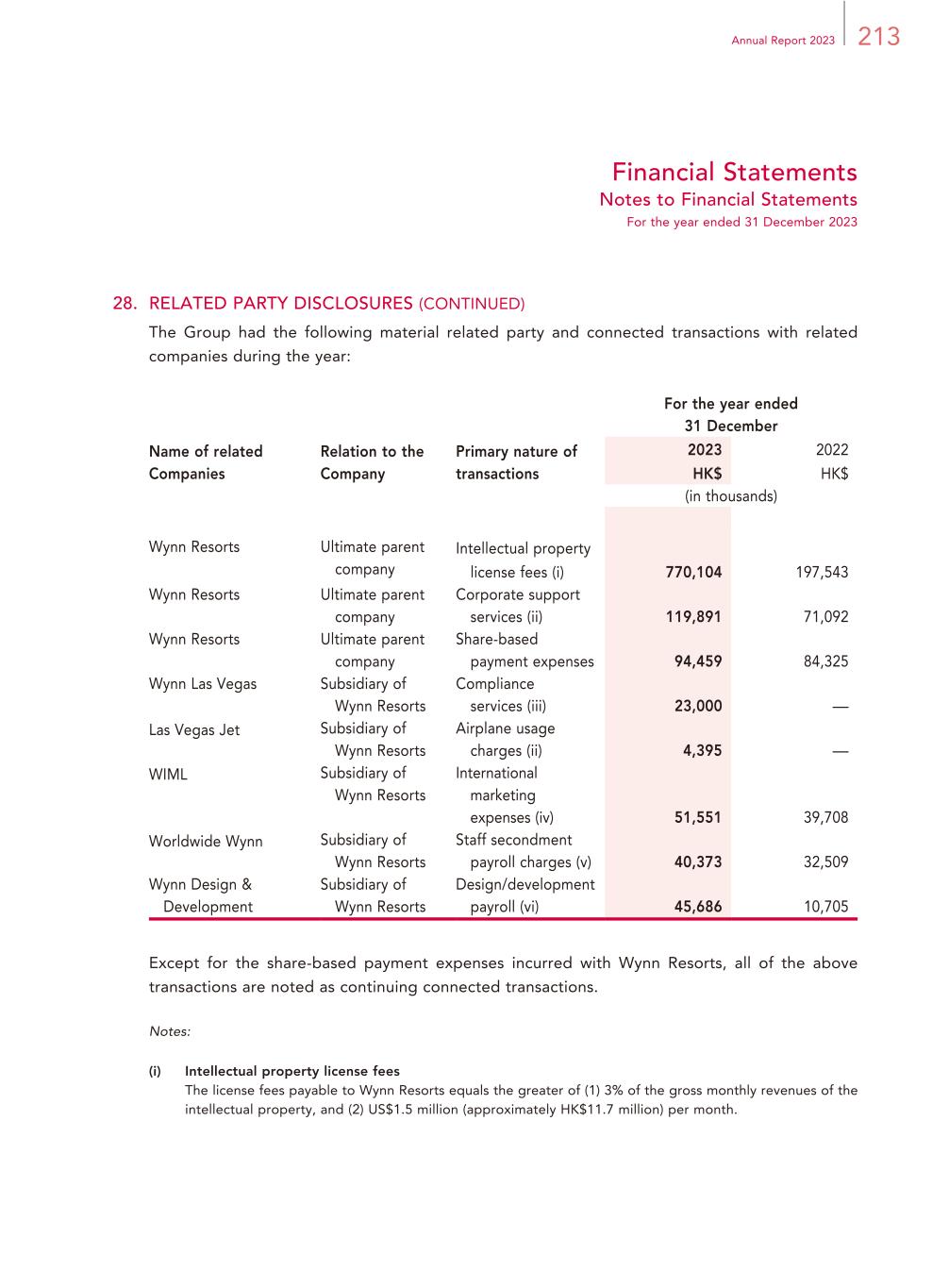 213Annual Report 2023 Financial Statements Notes to Financial Statements For the year ended 31 December 2023 28. RELATED PARTY DISCLOSURES (CONTINUED) The Group had the following material related party and connected transactions with related companies during the year: For the year ended 31 December Name of related Companies Relation to the Company Primary nature of transactions 2023 2022 HK$ HK$ (in thousands) Wynn Resorts Ultimate parent company Intellectual property license fees (i) 770,104 197,543 Wynn Resorts Ultimate parent company Corporate support services (ii) 119,891 71,092 Wynn Resorts Ultimate parent company Share-based payment expenses 94,459 84,325 Wynn Las Vegas Subsidiary of Wynn Resorts Compliance services (iii) 23,000 — Las Vegas Jet Subsidiary of Wynn Resorts Airplane usage charges (ii) 4,395 — WIML Subsidiary of Wynn Resorts International marketing expenses (iv) 51,551 39,708 Worldwide Wynn Subsidiary of Wynn Resorts Staff secondment payroll charges (v) 40,373 32,509 Wynn Design & Development Subsidiary of Wynn Resorts Design/development payroll (vi) 45,686 10,705 Except for the share-based payment expenses incurred with Wynn Resorts, all of the above transactions are noted as continuing connected transactions. Notes: (i) Intellectual property license fees The license fees payable to Wynn Resorts equals the greater of (1) 3% of the gross monthly revenues of the intellectual property, and (2) US$1.5 million (approximately HK$11.7 million) per month.