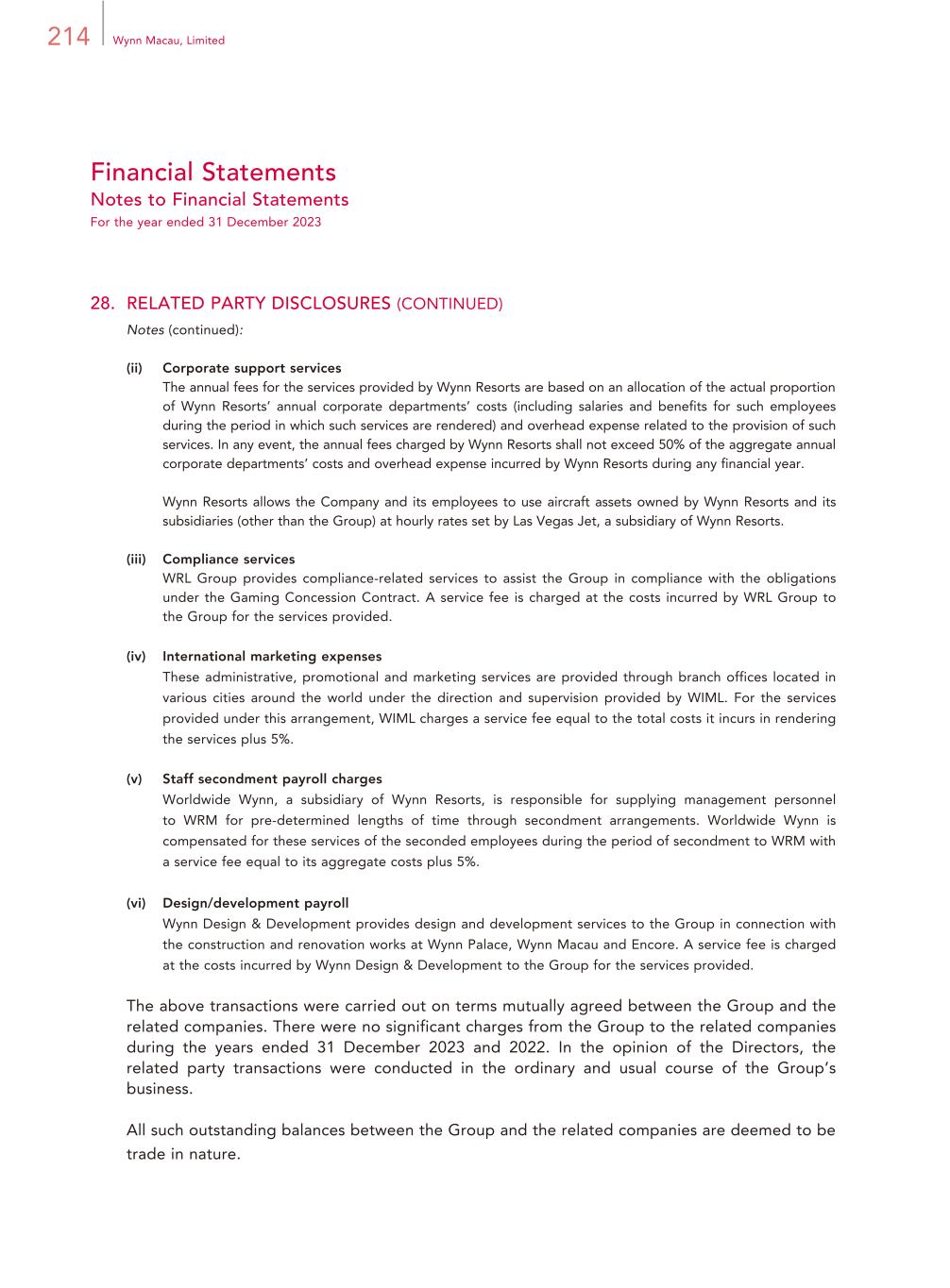 214 Wynn Macau, Limited Financial Statements Notes to Financial Statements For the year ended 31 December 2023 28. RELATED PARTY DISCLOSURES (CONTINUED) Notes (continued): (ii) Corporate support services The annual fees for the services provided by Wynn Resorts are based on an allocation of the actual proportion of Wynn Resorts’ annual corporate departments’ costs (including salaries and benefits for such employees during the period in which such services are rendered) and overhead expense related to the provision of such services. In any event, the annual fees charged by Wynn Resorts shall not exceed 50% of the aggregate annual corporate departments’ costs and overhead expense incurred by Wynn Resorts during any financial year. Wynn Resorts allows the Company and its employees to use aircraft assets owned by Wynn Resorts and its subsidiaries (other than the Group) at hourly rates set by Las Vegas Jet, a subsidiary of Wynn Resorts. (iii) Compliance services WRL Group provides compliance-related services to assist the Group in compliance with the obligations under the Gaming Concession Contract. A service fee is charged at the costs incurred by WRL Group to the Group for the services provided. (iv) International marketing expenses These administrative, promotional and marketing services are provided through branch offices located in various cities around the world under the direction and supervision provided by WIML. For the services provided under this arrangement, WIML charges a service fee equal to the total costs it incurs in rendering the services plus 5%. (v) Staff secondment payroll charges Worldwide Wynn, a subsidiary of Wynn Resorts, is responsible for supplying management personnel to WRM for pre-determined lengths of time through secondment arrangements. Worldwide Wynn is compensated for these services of the seconded employees during the period of secondment to WRM with a service fee equal to its aggregate costs plus 5%. (vi) Design/development payroll Wynn Design & Development provides design and development services to the Group in connection with the construction and renovation works at Wynn Palace, Wynn Macau and Encore. A service fee is charged at the costs incurred by Wynn Design & Development to the Group for the services provided. The above transactions were carried out on terms mutually agreed between the Group and the related companies. There were no significant charges from the Group to the related companies during the years ended 31 December 2023 and 2022. In the opinion of the Directors, the related party transactions were conducted in the ordinary and usual course of the Group’s business. All such outstanding balances between the Group and the related companies are deemed to be trade in nature.