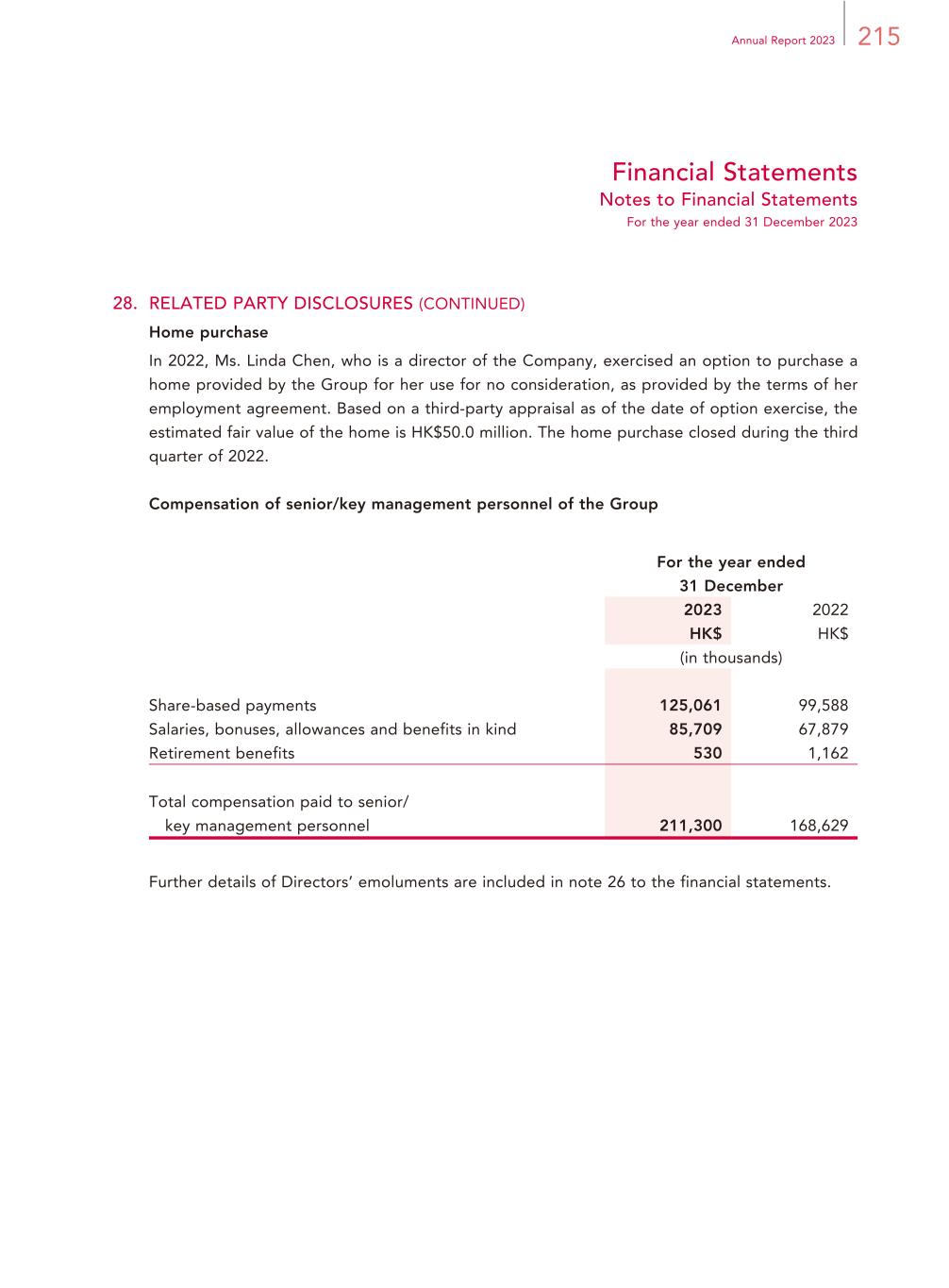 215Annual Report 2023 Financial Statements Notes to Financial Statements For the year ended 31 December 2023 28. RELATED PARTY DISCLOSURES (CONTINUED) Home purchase In 2022, Ms. Linda Chen, who is a director of the Company, exercised an option to purchase a home provided by the Group for her use for no consideration, as provided by the terms of her employment agreement. Based on a third-party appraisal as of the date of option exercise, the estimated fair value of the home is HK$50.0 million. The home purchase closed during the third quarter of 2022. Compensation of senior/key management personnel of the Group For the year ended 31 December 2023 2022 HK$ HK$ (in thousands) Share-based payments 125,061 99,588 Salaries, bonuses, allowances and benefits in kind 85,709 67,879 Retirement benefits 530 1,162 Total compensation paid to senior/ key management personnel 211,300 168,629 Further details of Directors’ emoluments are included in note 26 to the financial statements.