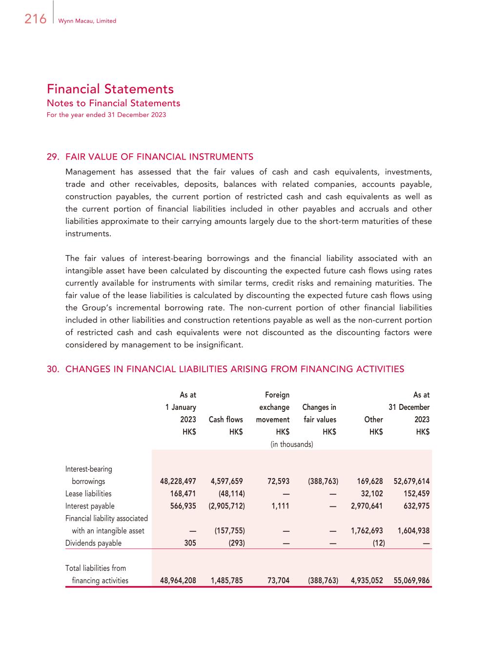 216 Wynn Macau, Limited Financial Statements Notes to Financial Statements For the year ended 31 December 2023 29. FAIR VALUE OF FINANCIAL INSTRUMENTS Management has assessed that the fair values of cash and cash equivalents, investments, trade and other receivables, deposits, balances with related companies, accounts payable, construction payables, the current portion of restricted cash and cash equivalents as well as the current portion of financial liabilities included in other payables and accruals and other liabilities approximate to their carrying amounts largely due to the short-term maturities of these instruments. The fair values of interest-bearing borrowings and the financial liability associated with an intangible asset have been calculated by discounting the expected future cash flows using rates currently available for instruments with similar terms, credit risks and remaining maturities. The fair value of the lease liabilities is calculated by discounting the expected future cash flows using the Group’s incremental borrowing rate. The non-current portion of other financial liabilities included in other liabilities and construction retentions payable as well as the non-current portion of restricted cash and cash equivalents were not discounted as the discounting factors were considered by management to be insignificant. 30. CHANGES IN FINANCIAL LIABILITIES ARISING FROM FINANCING ACTIVITIES As at 1 January 2023 Cash flows Foreign exchange movement Changes in fair values Other As at 31 December 2023 HK$ HK$ HK$ HK$ HK$ HK$ (in thousands) Interest-bearing borrowings 48,228,497 4,597,659 72,593 (388,763) 169,628 52,679,614 Lease liabilities 168,471 (48,114) — — 32,102 152,459 Interest payable 566,935 (2,905,712) 1,111 — 2,970,641 632,975 Financial liability associated with an intangible asset — (157,755) — — 1,762,693 1,604,938 Dividends payable 305 (293) — — (12) — Total liabilities from financing activities 48,964,208 1,485,785 73,704 (388,763) 4,935,052 55,069,986