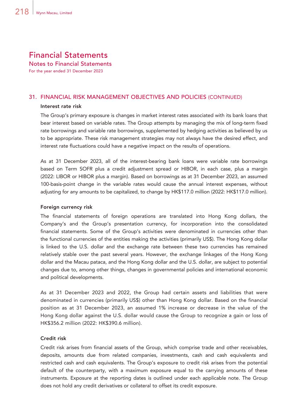 218 Wynn Macau, Limited Financial Statements Notes to Financial Statements For the year ended 31 December 2023 31. FINANCIAL RISK MANAGEMENT OBJECTIVES AND POLICIES (CONTINUED) Interest rate risk The Group’s primary exposure is changes in market interest rates associated with its bank loans that bear interest based on variable rates. The Group attempts by managing the mix of long-term fixed rate borrowings and variable rate borrowings, supplemented by hedging activities as believed by us to be appropriate. These risk management strategies may not always have the desired effect, and interest rate fluctuations could have a negative impact on the results of operations. As at 31 December 2023, all of the interest-bearing bank loans were variable rate borrowings based on Term SOFR plus a credit adjustment spread or HIBOR, in each case, plus a margin (2022: LIBOR or HIBOR plus a margin). Based on borrowings as at 31 December 2023, an assumed 100-basis-point change in the variable rates would cause the annual interest expenses, without adjusting for any amounts to be capitalized, to change by HK$117.0 million (2022: HK$117.0 million). Foreign currency risk The financial statements of foreign operations are translated into Hong Kong dollars, the Company’s and the Group’s presentation currency, for incorporation into the consolidated financial statements. Some of the Group’s activities were denominated in currencies other than the functional currencies of the entities making the activities (primarily US$). The Hong Kong dollar is linked to the U.S. dollar and the exchange rate between these two currencies has remained relatively stable over the past several years. However, the exchange linkages of the Hong Kong dollar and the Macau pataca, and the Hong Kong dollar and the U.S. dollar, are subject to potential changes due to, among other things, changes in governmental policies and international economic and political developments. As at 31 December 2023 and 2022, the Group had certain assets and liabilities that were denominated in currencies (primarily US$) other than Hong Kong dollar. Based on the financial position as at 31 December 2023, an assumed 1% increase or decrease in the value of the Hong Kong dollar against the U.S. dollar would cause the Group to recognize a gain or loss of HK$356.2 million (2022: HK$390.6 million). Credit risk Credit risk arises from financial assets of the Group, which comprise trade and other receivables, deposits, amounts due from related companies, investments, cash and cash equivalents and restricted cash and cash equivalents. The Group’s exposure to credit risk arises from the potential default of the counterparty, with a maximum exposure equal to the carrying amounts of these instruments. Exposure at the reporting dates is outlined under each applicable note. The Group does not hold any credit derivatives or collateral to offset its credit exposure.