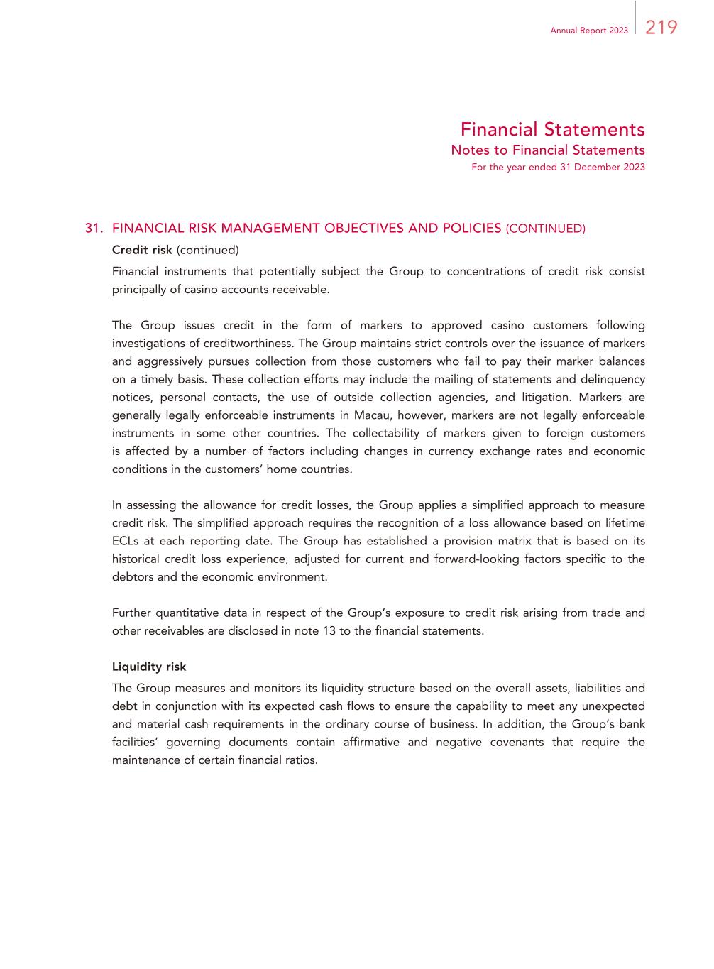 219Annual Report 2023 Financial Statements Notes to Financial Statements For the year ended 31 December 2023 31. FINANCIAL RISK MANAGEMENT OBJECTIVES AND POLICIES (CONTINUED) Credit risk (continued) Financial instruments that potentially subject the Group to concentrations of credit risk consist principally of casino accounts receivable. The Group issues credit in the form of markers to approved casino customers following investigations of creditworthiness. The Group maintains strict controls over the issuance of markers and aggressively pursues collection from those customers who fail to pay their marker balances on a timely basis. These collection efforts may include the mailing of statements and delinquency notices, personal contacts, the use of outside collection agencies, and litigation. Markers are generally legally enforceable instruments in Macau, however, markers are not legally enforceable instruments in some other countries. The collectability of markers given to foreign customers is affected by a number of factors including changes in currency exchange rates and economic conditions in the customers’ home countries. In assessing the allowance for credit losses, the Group applies a simplified approach to measure credit risk. The simplified approach requires the recognition of a loss allowance based on lifetime ECLs at each reporting date. The Group has established a provision matrix that is based on its historical credit loss experience, adjusted for current and forward-looking factors specific to the debtors and the economic environment. Further quantitative data in respect of the Group’s exposure to credit risk arising from trade and other receivables are disclosed in note 13 to the financial statements. Liquidity risk The Group measures and monitors its liquidity structure based on the overall assets, liabilities and debt in conjunction with its expected cash flows to ensure the capability to meet any unexpected and material cash requirements in the ordinary course of business. In addition, the Group’s bank facilities’ governing documents contain affirmative and negative covenants that require the maintenance of certain financial ratios.