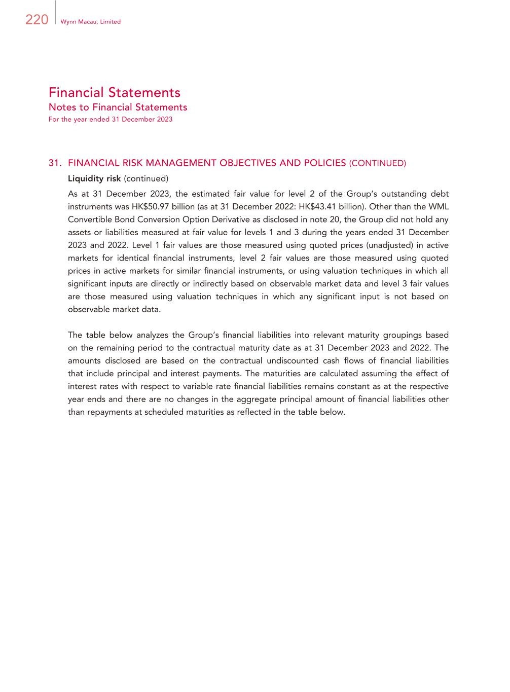 220 Wynn Macau, Limited Financial Statements Notes to Financial Statements For the year ended 31 December 2023 31. FINANCIAL RISK MANAGEMENT OBJECTIVES AND POLICIES (CONTINUED) Liquidity risk (continued) As at 31 December 2023, the estimated fair value for level 2 of the Group’s outstanding debt instruments was HK$50.97 billion (as at 31 December 2022: HK$43.41 billion). Other than the WML Convertible Bond Conversion Option Derivative as disclosed in note 20, the Group did not hold any assets or liabilities measured at fair value for levels 1 and 3 during the years ended 31 December 2023 and 2022. Level 1 fair values are those measured using quoted prices (unadjusted) in active markets for identical financial instruments, level 2 fair values are those measured using quoted prices in active markets for similar financial instruments, or using valuation techniques in which all significant inputs are directly or indirectly based on observable market data and level 3 fair values are those measured using valuation techniques in which any significant input is not based on observable market data. The table below analyzes the Group’s financial liabilities into relevant maturity groupings based on the remaining period to the contractual maturity date as at 31 December 2023 and 2022. The amounts disclosed are based on the contractual undiscounted cash flows of financial liabilities that include principal and interest payments. The maturities are calculated assuming the effect of interest rates with respect to variable rate financial liabilities remains constant as at the respective year ends and there are no changes in the aggregate principal amount of financial liabilities other than repayments at scheduled maturities as reflected in the table below.