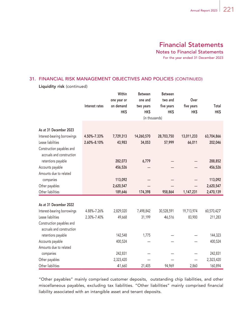 221Annual Report 2023 Financial Statements Notes to Financial Statements For the year ended 31 December 2023 31. FINANCIAL RISK MANAGEMENT OBJECTIVES AND POLICIES (CONTINUED) Liquidity risk (continued) Interest rates Within one year or on demand Between one and two years Between two and five years Over five years Total HK$ HK$ HK$ HK$ HK$ (in thousands) As at 31 December 2023 Interest-bearing borrowings 4.50%–7.33% 7,729,313 14,260,570 28,703,750 13,011,233 63,704,866 Lease liabilities 2.60%–8.10% 43,983 34,053 57,999 66,011 202,046 Construction payables and accruals and construction retentions payable 282,073 6,779 — — 288,852 Accounts payable 456,526 — — — 456,526 Amounts due to related companies 113,092 — — — 113,092 Other payables 2,620,547 — — — 2,620,547 Other liabilities 189,646 174,398 958,864 1,147,231 2,470,139 As at 31 December 2022 Interest-bearing borrowings 4.88%–7.26% 2,829,020 7,498,842 30,528,591 19,713,974 60,570,427 Lease liabilities 2.30%–7.40% 49,668 31,199 46,516 83,900 211,283 Construction payables and accruals and construction retentions payable 142,548 1,775 — — 144,323 Accounts payable 400,524 — — — 400,524 Amounts due to related companies 242,831 — — — 242,831 Other payables 2,323,420 — — — 2,323,420 Other liabilities 41,660 21,405 94,969 2,860 160,894 “Other payables” mainly comprised customer deposits, outstanding chip liabilities, and other miscellaneous payables, excluding tax liabilities. “Other liabilities” mainly comprised financial liability associated with an intangible asset and tenant deposits.