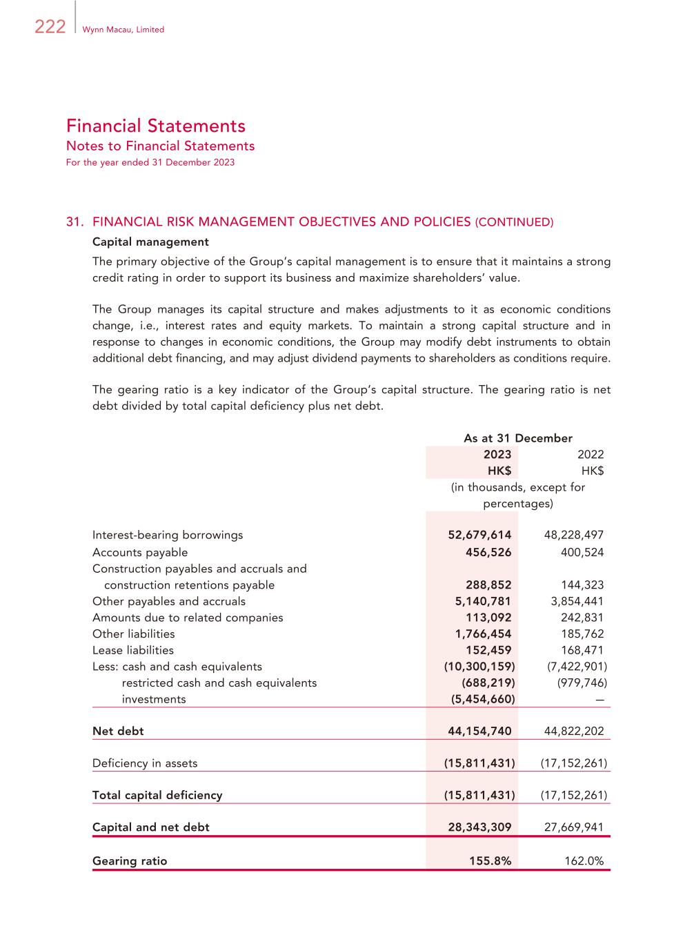222 Wynn Macau, Limited Financial Statements Notes to Financial Statements For the year ended 31 December 2023 31. FINANCIAL RISK MANAGEMENT OBJECTIVES AND POLICIES (CONTINUED) Capital management The primary objective of the Group’s capital management is to ensure that it maintains a strong credit rating in order to support its business and maximize shareholders’ value. The Group manages its capital structure and makes adjustments to it as economic conditions change, i.e., interest rates and equity markets. To maintain a strong capital structure and in response to changes in economic conditions, the Group may modify debt instruments to obtain additional debt financing, and may adjust dividend payments to shareholders as conditions require. The gearing ratio is a key indicator of the Group’s capital structure. The gearing ratio is net debt divided by total capital deficiency plus net debt. As at 31 December 2023 2022 HK$ HK$ (in thousands, except for percentages) Interest-bearing borrowings 52,679,614 48,228,497 Accounts payable 456,526 400,524 Construction payables and accruals and construction retentions payable 288,852 144,323 Other payables and accruals 5,140,781 3,854,441 Amounts due to related companies 113,092 242,831 Other liabilities 1,766,454 185,762 Lease liabilities 152,459 168,471 Less: cash and cash equivalents (10,300,159) (7,422,901) restricted cash and cash equivalents (688,219) (979,746) investments (5,454,660) — Net debt 44,154,740 44,822,202 Deficiency in assets (15,811,431) (17,152,261) Total capital deficiency (15,811,431) (17,152,261) Capital and net debt 28,343,309 27,669,941 Gearing ratio 155.8% 162.0%