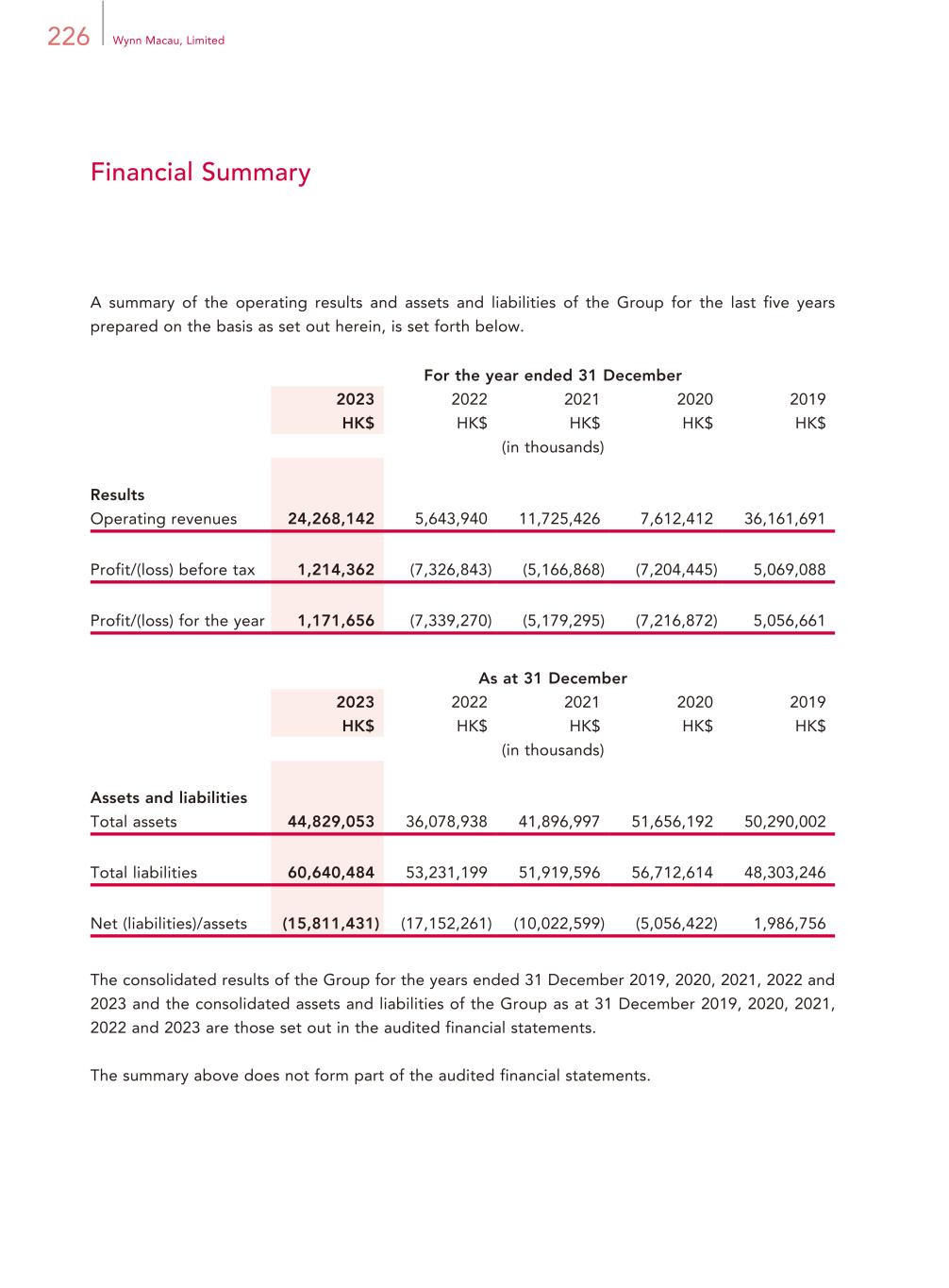 226 Wynn Macau, Limited Financial Summary A summary of the operating results and assets and liabilities of the Group for the last five years prepared on the basis as set out herein, is set forth below. For the year ended 31 December 2023 2022 2021 2020 2019 HK$ HK$ HK$ HK$ HK$ (in thousands) Results Operating revenues 24,268,142 5,643,940 11,725,426 7,612,412 36,161,691 Profit/(loss) before tax 1,214,362 (7,326,843) (5,166,868) (7,204,445) 5,069,088 Profit/(loss) for the year 1,171,656 (7,339,270) (5,179,295) (7,216,872) 5,056,661 As at 31 December 2023 2022 2021 2020 2019 HK$ HK$ HK$ HK$ HK$ (in thousands) Assets and liabilities Total assets 44,829,053 36,078,938 41,896,997 51,656,192 50,290,002 Total liabilities 60,640,484 53,231,199 51,919,596 56,712,614 48,303,246 Net (liabilities)/assets (15,811,431) (17,152,261) (10,022,599) (5,056,422) 1,986,756 The consolidated results of the Group for the years ended 31 December 2019, 2020, 2021, 2022 and 2023 and the consolidated assets and liabilities of the Group as at 31 December 2019, 2020, 2021, 2022 and 2023 are those set out in the audited financial statements. The summary above does not form part of the audited financial statements.
