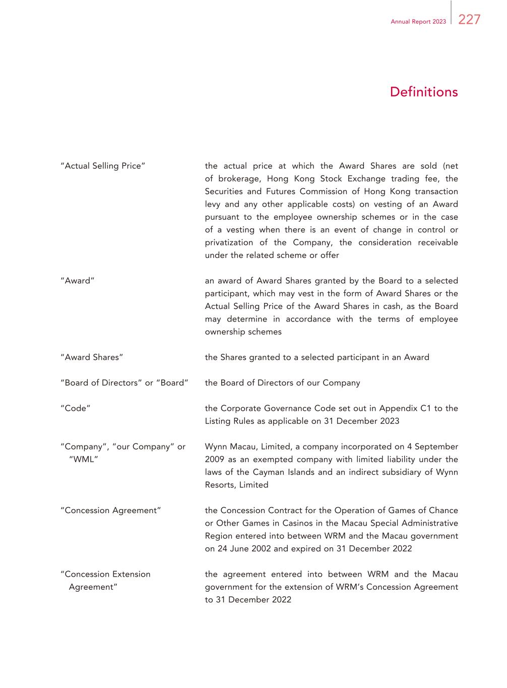 227Annual Report 2023 Definitions “Actual Selling Price” the actual price at which the Award Shares are sold (net of brokerage, Hong Kong Stock Exchange trading fee, the Securities and Futures Commission of Hong Kong transaction levy and any other applicable costs) on vesting of an Award pursuant to the employee ownership schemes or in the case of a vesting when there is an event of change in control or privatization of the Company, the consideration receivable under the related scheme or offer “Award” an award of Award Shares granted by the Board to a selected participant, which may vest in the form of Award Shares or the Actual Selling Price of the Award Shares in cash, as the Board may determine in accordance with the terms of employee ownership schemes “Award Shares” the Shares granted to a selected participant in an Award “Board of Directors” or “Board” the Board of Directors of our Company “Code” the Corporate Governance Code set out in Appendix C1 to the Listing Rules as applicable on 31 December 2023 “Company”, “our Company” or “WML” Wynn Macau, Limited, a company incorporated on 4 September 2009 as an exempted company with limited liability under the laws of the Cayman Islands and an indirect subsidiary of Wynn Resorts, Limited “Concession Agreement” the Concession Contract for the Operation of Games of Chance or Other Games in Casinos in the Macau Special Administrative Region entered into between WRM and the Macau government on 24 June 2002 and expired on 31 December 2022 “Concession Extension Agreement” the agreement entered into between WRM and the Macau government for the extension of WRM’s Concession Agreement to 31 December 2022