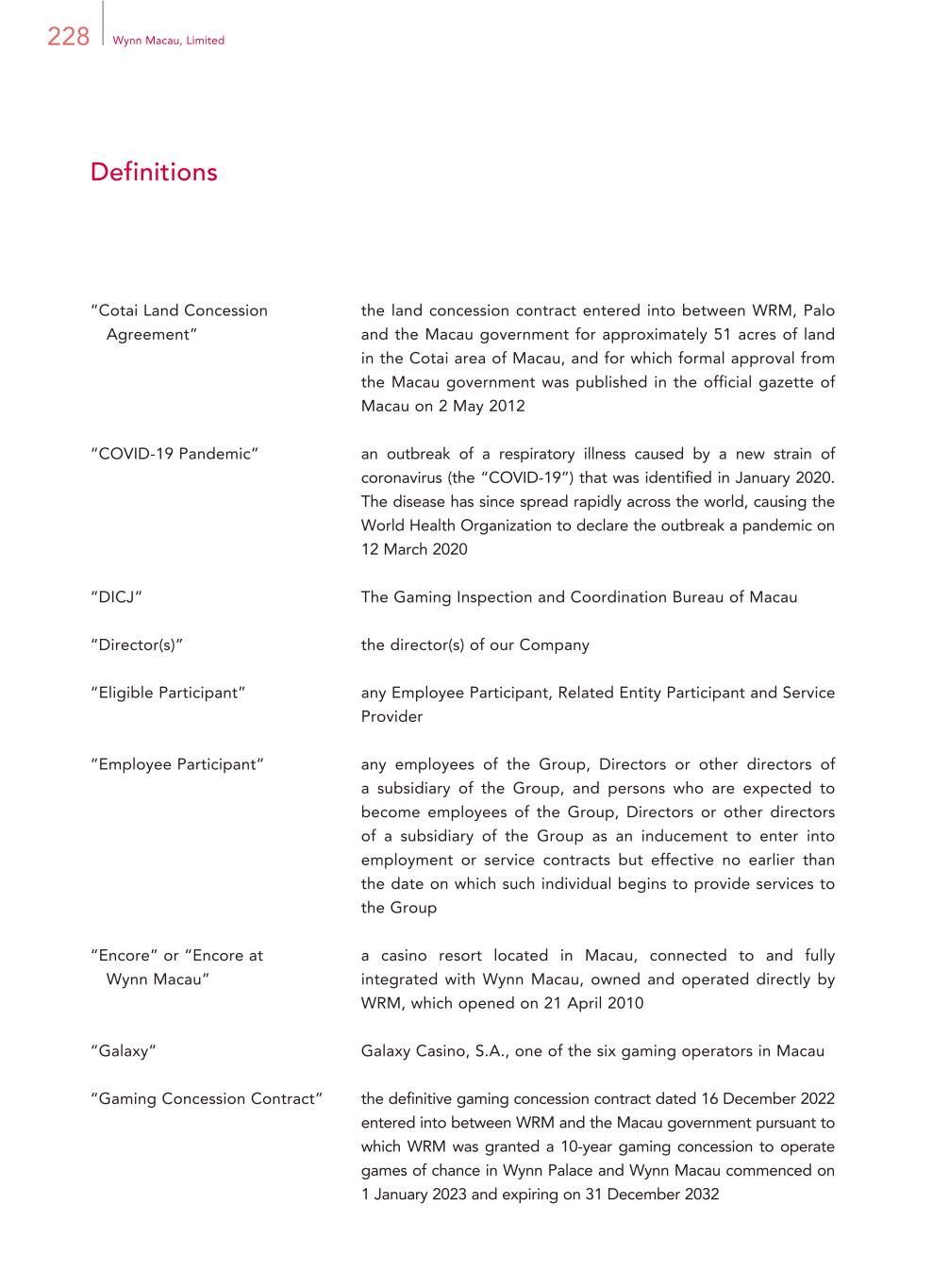 228 Wynn Macau, Limited Definitions “Cotai Land Concession Agreement” the land concession contract entered into between WRM, Palo and the Macau government for approximately 51 acres of land in the Cotai area of Macau, and for which formal approval from the Macau government was published in the official gazette of Macau on 2 May 2012 “COVID-19 Pandemic” an outbreak of a respiratory illness caused by a new strain of coronavirus (the “COVID-19”) that was identified in January 2020. The disease has since spread rapidly across the world, causing the World Health Organization to declare the outbreak a pandemic on 12 March 2020 “DICJ” The Gaming Inspection and Coordination Bureau of Macau “Director(s)” the director(s) of our Company “Eligible Participant” any Employee Participant, Related Entity Participant and Service Provider “Employee Participant” any employees of the Group, Directors or other directors of a subsidiary of the Group, and persons who are expected to become employees of the Group, Directors or other directors of a subsidiary of the Group as an inducement to enter into employment or service contracts but effective no earlier than the date on which such individual begins to provide services to the Group “Encore” or “Encore at Wynn Macau” a casino resort located in Macau, connected to and fully integrated with Wynn Macau, owned and operated directly by WRM, which opened on 21 April 2010 “Galaxy” Galaxy Casino, S.A., one of the six gaming operators in Macau “Gaming Concession Contract” the definitive gaming concession contract dated 16 December 2022 entered into between WRM and the Macau government pursuant to which WRM was granted a 10-year gaming concession to operate games of chance in Wynn Palace and Wynn Macau commenced on 1 January 2023 and expiring on 31 December 2032