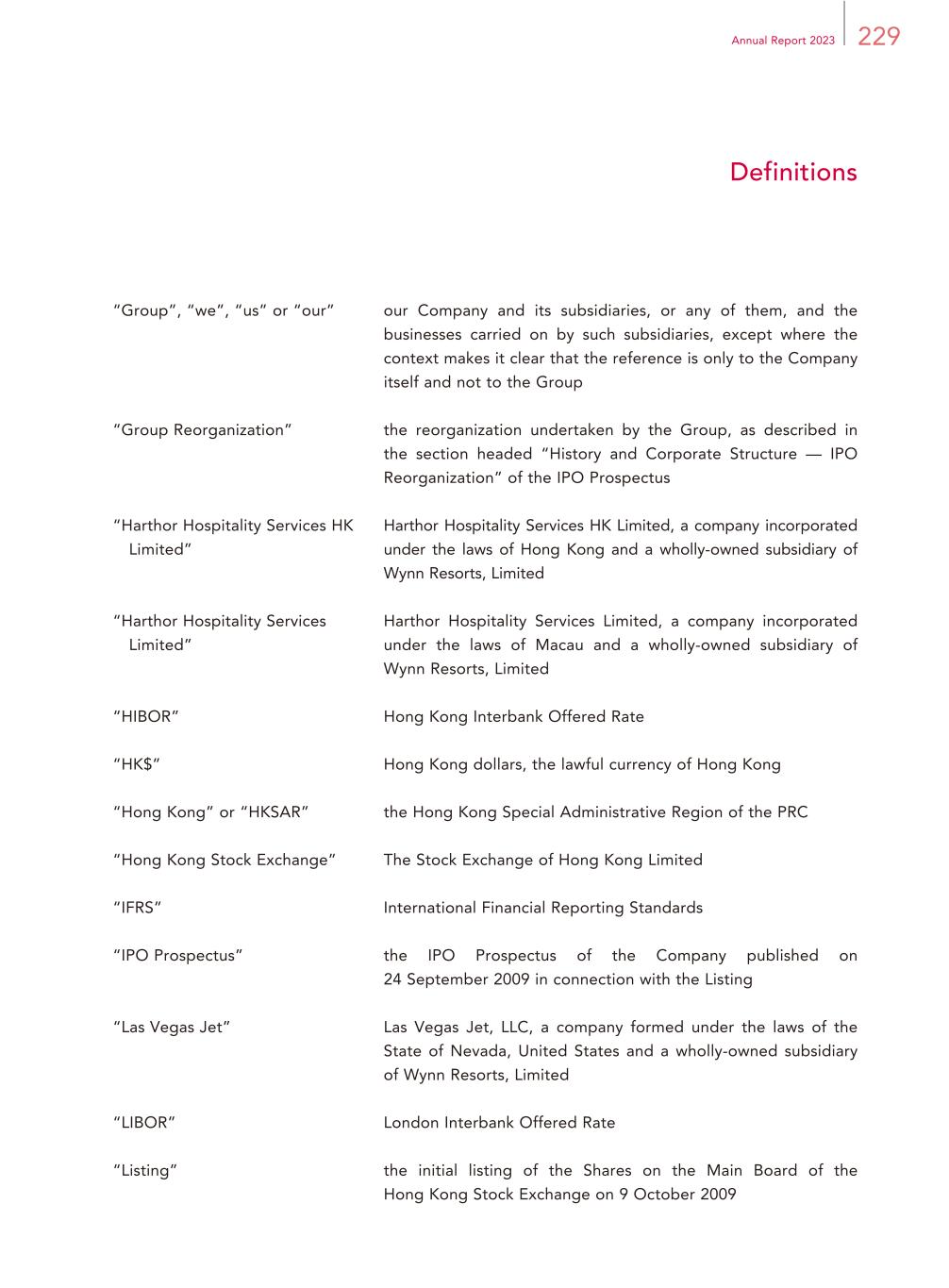 229Annual Report 2023 Definitions “Group”, “we”, “us” or “our” our Company and its subsidiaries, or any of them, and the businesses carried on by such subsidiaries, except where the context makes it clear that the reference is only to the Company itself and not to the Group “Group Reorganization” the reorganization undertaken by the Group, as described in the section headed “History and Corporate Structure — IPO Reorganization” of the IPO Prospectus “Harthor Hospitality Services HK Limited” Harthor Hospitality Services HK Limited, a company incorporated under the laws of Hong Kong and a wholly-owned subsidiary of Wynn Resorts, Limited “Harthor Hospitality Services Limited” Harthor Hospitality Services Limited, a company incorporated under the laws of Macau and a wholly-owned subsidiary of Wynn Resorts, Limited “HIBOR” Hong Kong Interbank Offered Rate “HK$” Hong Kong dollars, the lawful currency of Hong Kong “Hong Kong” or “HKSAR” the Hong Kong Special Administrative Region of the PRC “Hong Kong Stock Exchange” The Stock Exchange of Hong Kong Limited “IFRS” International Financial Reporting Standards “IPO Prospectus” the IPO Prospectus of the Company published on 24 September 2009 in connection with the Listing “Las Vegas Jet” Las Vegas Jet, LLC, a company formed under the laws of the State of Nevada, United States and a wholly-owned subsidiary of Wynn Resorts, Limited “LIBOR” London Interbank Offered Rate “Listing” the initial listing of the Shares on the Main Board of the Hong Kong Stock Exchange on 9 October 2009