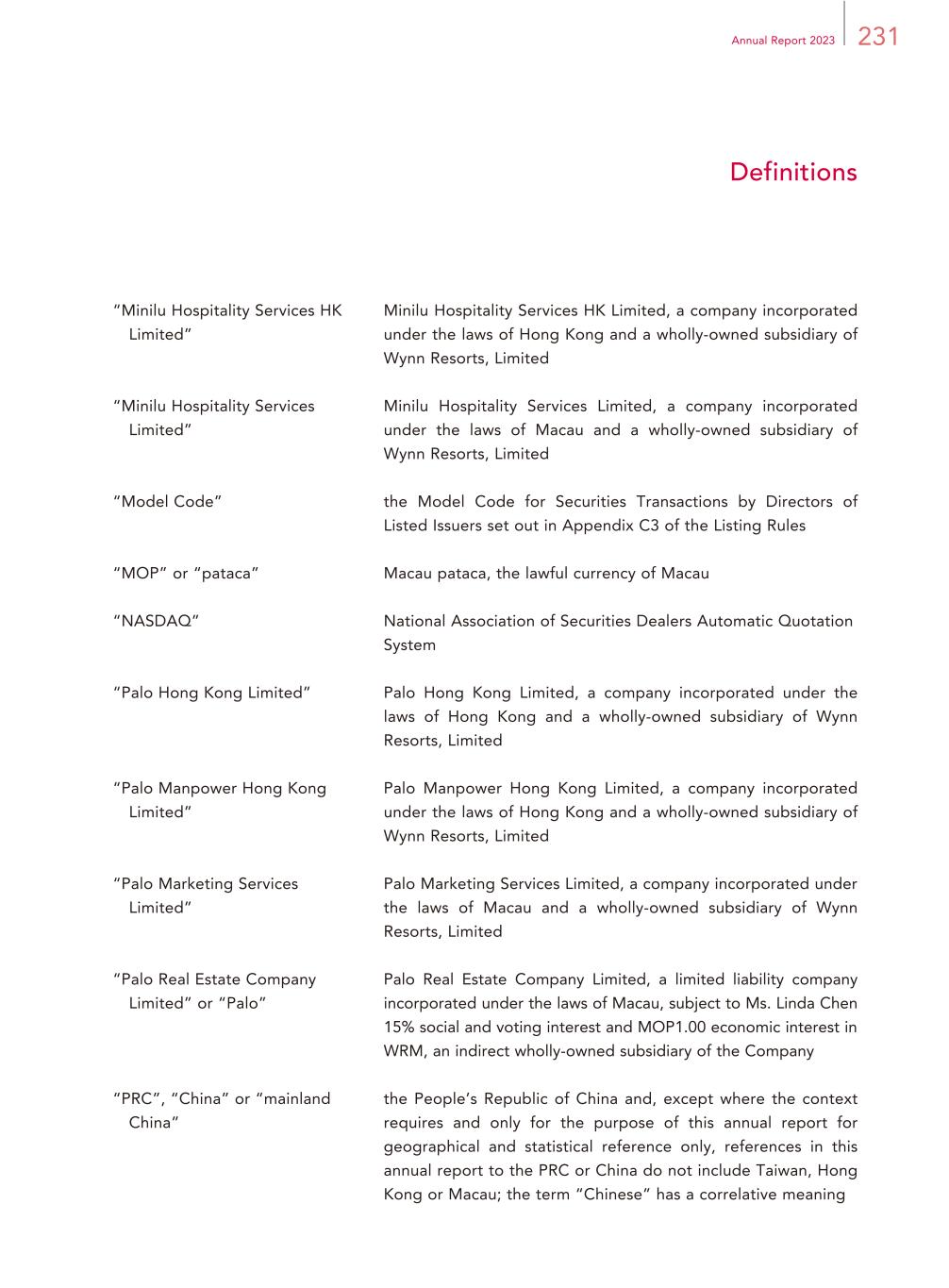 231Annual Report 2023 Definitions “Minilu Hospitality Services HK Limited” Minilu Hospitality Services HK Limited, a company incorporated under the laws of Hong Kong and a wholly-owned subsidiary of Wynn Resorts, Limited “Minilu Hospitality Services Limited” Minilu Hospitality Services Limited, a company incorporated under the laws of Macau and a wholly-owned subsidiary of Wynn Resorts, Limited “Model Code” the Model Code for Securities Transactions by Directors of Listed Issuers set out in Appendix C3 of the Listing Rules “MOP” or “pataca” Macau pataca, the lawful currency of Macau “NASDAQ” National Association of Securities Dealers Automatic Quotation System “Palo Hong Kong Limited” Palo Hong Kong Limited, a company incorporated under the laws of Hong Kong and a wholly-owned subsidiary of Wynn Resorts, Limited “Palo Manpower Hong Kong Limited” Palo Manpower Hong Kong Limited, a company incorporated under the laws of Hong Kong and a wholly-owned subsidiary of Wynn Resorts, Limited “Palo Marketing Services Limited” Palo Marketing Services Limited, a company incorporated under the laws of Macau and a wholly-owned subsidiary of Wynn Resorts, Limited “Palo Real Estate Company Limited” or “Palo” Palo Real Estate Company Limited, a limited liability company incorporated under the laws of Macau, subject to Ms. Linda Chen 15% social and voting interest and MOP1.00 economic interest in WRM, an indirect wholly-owned subsidiary of the Company “PRC”, “China” or “mainland China” the People’s Republic of China and, except where the context requires and only for the purpose of this annual report for geographical and statistical reference only, references in this annual report to the PRC or China do not include Taiwan, Hong Kong or Macau; the term “Chinese” has a correlative meaning