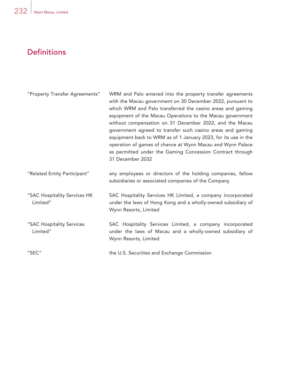 232 Wynn Macau, Limited Definitions “Property Transfer Agreements” WRM and Palo entered into the property transfer agreements with the Macau government on 30 December 2022, pursuant to which WRM and Palo transferred the casino areas and gaming equipment of the Macau Operations to the Macau government without compensation on 31 December 2022, and the Macau government agreed to transfer such casino areas and gaming equipment back to WRM as of 1 January 2023, for its use in the operation of games of chance at Wynn Macau and Wynn Palace as permitted under the Gaming Concession Contract through 31 December 2032 “Related Entity Participant” any employees or directors of the holding companies, fellow subsidiaries or associated companies of the Company “SAC Hospitality Services HK Limited” SAC Hospitality Services HK Limited, a company incorporated under the laws of Hong Kong and a wholly-owned subsidiary of Wynn Resorts, Limited “SAC Hospitality Services Limited” SAC Hospitality Services Limited, a company incorporated under the laws of Macau and a wholly-owned subsidiary of Wynn Resorts, Limited “SEC” the U.S. Securities and Exchange Commission