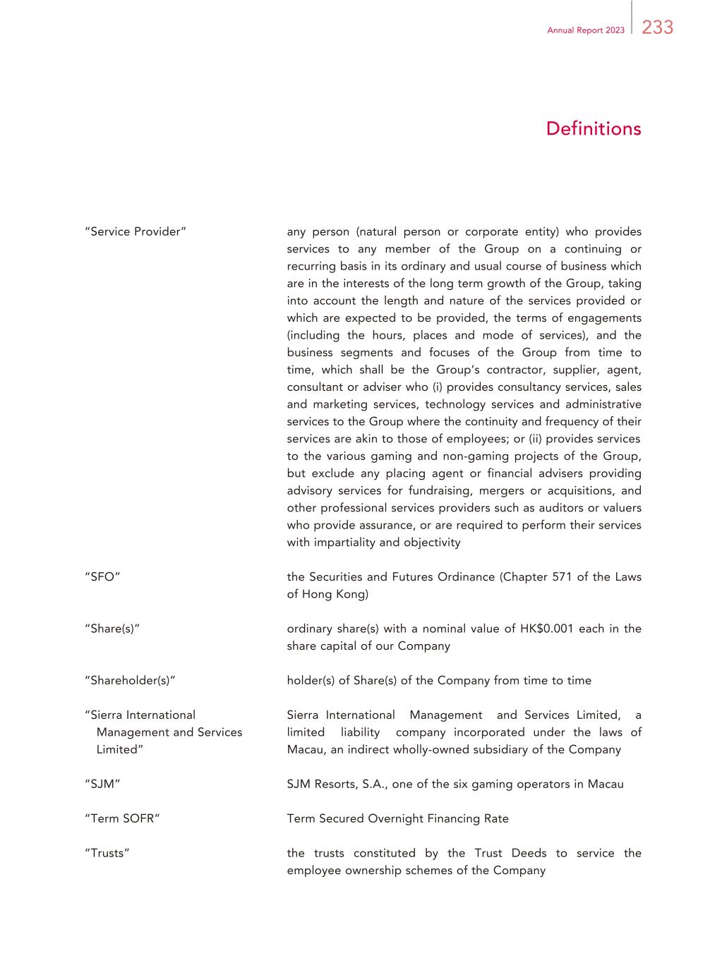 233Annual Report 2023 Definitions “Service Provider” any person (natural person or corporate entity) who provides services to any member of the Group on a continuing or recurring basis in its ordinary and usual course of business which are in the interests of the long term growth of the Group, taking into account the length and nature of the services provided or which are expected to be provided, the terms of engagements (including the hours, places and mode of services), and the business segments and focuses of the Group from time to time, which shall be the Group’s contractor, supplier, agent, consultant or adviser who (i) provides consultancy services, sales and marketing services, technology services and administrative services to the Group where the continuity and frequency of their services are akin to those of employees; or (ii) provides services to the various gaming and non-gaming projects of the Group, but exclude any placing agent or financial advisers providing advisory services for fundraising, mergers or acquisitions, and other professional services providers such as auditors or valuers who provide assurance, or are required to perform their services with impartiality and objectivity “SFO” the Securities and Futures Ordinance (Chapter 571 of the Laws of Hong Kong) “Share(s)” ordinary share(s) with a nominal value of HK$0.001 each in the share capital of our Company “Shareholder(s)” holder(s) of Share(s) of the Company from time to time “Sierra International Management and Services Limited” Sierra International Management and Services Limited, a limited liability company incorporated under the laws of Macau, an indirect wholly-owned subsidiary of the Company “SJM” SJM Resorts, S.A., one of the six gaming operators in Macau “Term SOFR” Term Secured Overnight Financing Rate “Trusts” the trusts constituted by the Trust Deeds to service the employee ownership schemes of the Company