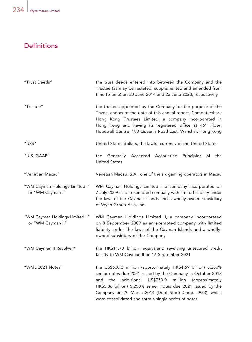 234 Wynn Macau, Limited Definitions “Trust Deeds” the trust deeds entered into between the Company and the Trustee (as may be restated, supplemented and amended from time to time) on 30 June 2014 and 23 June 2023, respectively “Trustee” the trustee appointed by the Company for the purpose of the Trusts, and as at the date of this annual report, Computershare Hong Kong Trustees Limited, a company incorporated in Hong Kong and having its registered office at 46th Floor, Hopewell Centre, 183 Queen’s Road East, Wanchai, Hong Kong “US$” United States dollars, the lawful currency of the United States “U.S. GAAP” the Generally Accepted Accounting Principles of the United States “Venetian Macau” Venetian Macau, S.A., one of the six gaming operators in Macau “WM Cayman Holdings Limited I” or “WM Cayman I” WM Cayman Holdings Limited I, a company incorporated on 7 July 2009 as an exempted company with limited liability under the laws of the Cayman Islands and a wholly-owned subsidiary of Wynn Group Asia, Inc. “WM Cayman Holdings Limited II” or “WM Cayman II” WM Cayman Holdings Limited II, a company incorporated on 8 September 2009 as an exempted company with limited liability under the laws of the Cayman Islands and a wholly- owned subsidiary of the Company “WM Cayman II Revolver” the HK$11.70 billion (equivalent) revolving unsecured credit facility to WM Cayman II on 16 September 2021 “WML 2021 Notes” the US$600.0 million (approximately HK$4.69 billion) 5.250% senior notes due 2021 issued by the Company in October 2013 and the additional US$750.0 million (approximately HK$5.86 billion) 5.250% senior notes due 2021 issued by the Company on 20 March 2014 (Debt Stock Code: 5983), which were consolidated and form a single series of notes