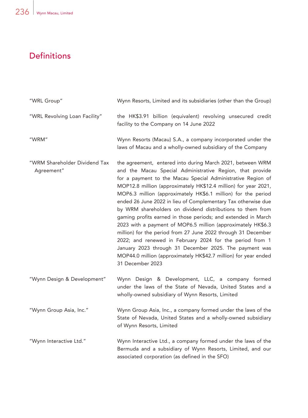 236 Wynn Macau, Limited Definitions “WRL Group” Wynn Resorts, Limited and its subsidiaries (other than the Group) “WRL Revolving Loan Facility” the HK$3.91 billion (equivalent) revolving unsecured credit facility to the Company on 14 June 2022 “WRM” Wynn Resorts (Macau) S.A., a company incorporated under the laws of Macau and a wholly-owned subsidiary of the Company “WRM Shareholder Dividend Tax Agreement” the agreement, entered into during March 2021, between WRM and the Macau Special Administrative Region, that provide for a payment to the Macau Special Administrative Region of MOP12.8 million (approximately HK$12.4 million) for year 2021, MOP6.3 million (approximately HK$6.1 million) for the period ended 26 June 2022 in lieu of Complementary Tax otherwise due by WRM shareholders on dividend distributions to them from gaming profits earned in those periods; and extended in March 2023 with a payment of MOP6.5 million (approximately HK$6.3 million) for the period from 27 June 2022 through 31 December 2022; and renewed in February 2024 for the period from 1 January 2023 through 31 December 2025. The payment was MOP44.0 million (approximately HK$42.7 million) for year ended 31 December 2023 “Wynn Design & Development” Wynn Design & Development, LLC, a company formed under the laws of the State of Nevada, United States and a wholly-owned subsidiary of Wynn Resorts, Limited “Wynn Group Asia, Inc.” Wynn Group Asia, Inc., a company formed under the laws of the State of Nevada, United States and a wholly-owned subsidiary of Wynn Resorts, Limited “Wynn Interactive Ltd.” Wynn Interactive Ltd., a company formed under the laws of the Bermuda and a subsidiary of Wynn Resorts, Limited, and our associated corporation (as defined in the SFO)