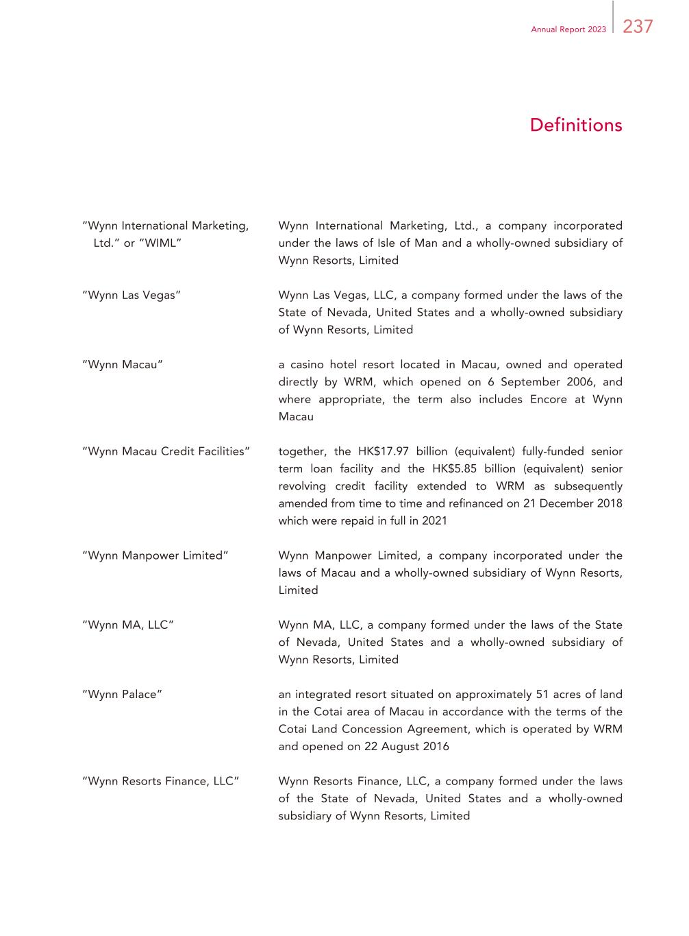 237Annual Report 2023 Definitions “Wynn International Marketing, Ltd.” or “WIML” Wynn International Marketing, Ltd., a company incorporated under the laws of Isle of Man and a wholly-owned subsidiary of Wynn Resorts, Limited “Wynn Las Vegas” Wynn Las Vegas, LLC, a company formed under the laws of the State of Nevada, United States and a wholly-owned subsidiary of Wynn Resorts, Limited “Wynn Macau” a casino hotel resort located in Macau, owned and operated directly by WRM, which opened on 6 September 2006, and where appropriate, the term also includes Encore at Wynn Macau “Wynn Macau Credit Facilities” together, the HK$17.97 billion (equivalent) fully-funded senior term loan facility and the HK$5.85 billion (equivalent) senior revolving credit facility extended to WRM as subsequently amended from time to time and refinanced on 21 December 2018 which were repaid in full in 2021 “Wynn Manpower Limited” Wynn Manpower Limited, a company incorporated under the laws of Macau and a wholly-owned subsidiary of Wynn Resorts, Limited “Wynn MA, LLC” Wynn MA, LLC, a company formed under the laws of the State of Nevada, United States and a wholly-owned subsidiary of Wynn Resorts, Limited “Wynn Palace” an integrated resort situated on approximately 51 acres of land in the Cotai area of Macau in accordance with the terms of the Cotai Land Concession Agreement, which is operated by WRM and opened on 22 August 2016 “Wynn Resorts Finance, LLC” Wynn Resorts Finance, LLC, a company formed under the laws of the State of Nevada, United States and a wholly-owned subsidiary of Wynn Resorts, Limited