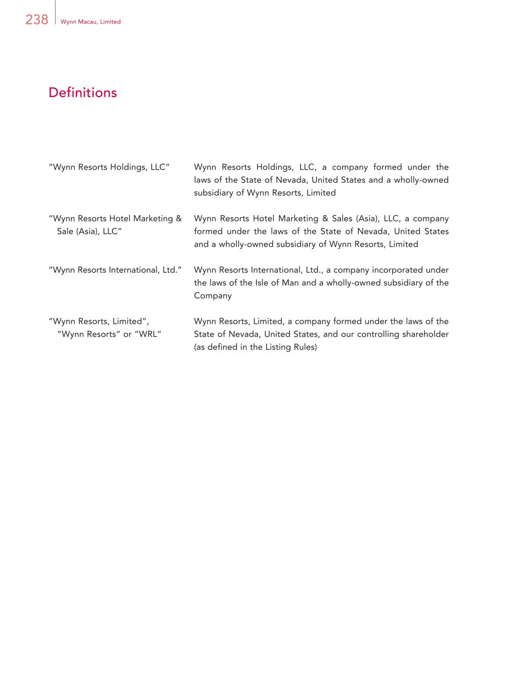 238 Wynn Macau, Limited Definitions “Wynn Resorts Holdings, LLC” Wynn Resorts Holdings, LLC, a company formed under the laws of the State of Nevada, United States and a wholly-owned subsidiary of Wynn Resorts, Limited “Wynn Resorts Hotel Marketing & Sale (Asia), LLC” Wynn Resorts Hotel Marketing & Sales (Asia), LLC, a company formed under the laws of the State of Nevada, United States and a wholly-owned subsidiary of Wynn Resorts, Limited “Wynn Resorts International, Ltd.” Wynn Resorts International, Ltd., a company incorporated under the laws of the Isle of Man and a wholly-owned subsidiary of the Company “Wynn Resorts, Limited”, “Wynn Resorts” or “WRL” Wynn Resorts, Limited, a company formed under the laws of the State of Nevada, United States, and our controlling shareholder (as defined in the Listing Rules)