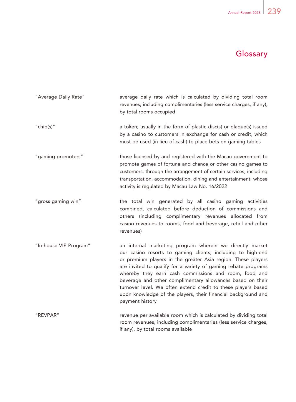 239Annual Report 2023 Glossary “Average Daily Rate” average daily rate which is calculated by dividing total room revenues, including complimentaries (less service charges, if any), by total rooms occupied “chip(s)” a token; usually in the form of plastic disc(s) or plaque(s) issued by a casino to customers in exchange for cash or credit, which must be used (in lieu of cash) to place bets on gaming tables “gaming promoters” those licensed by and registered with the Macau government to promote games of fortune and chance or other casino games to customers, through the arrangement of certain services, including transportation, accommodation, dining and entertainment, whose activity is regulated by Macau Law No. 16/2022 “gross gaming win” the total win generated by all casino gaming activities combined, calculated before deduction of commissions and others (including complimentary revenues allocated from casino revenues to rooms, food and beverage, retail and other revenues) “In-house VIP Program” an internal marketing program wherein we directly market our casino resorts to gaming clients, including to high-end or premium players in the greater Asia region. These players are invited to qualify for a variety of gaming rebate programs whereby they earn cash commissions and room, food and beverage and other complimentary allowances based on their turnover level. We often extend credit to these players based upon knowledge of the players, their financial background and payment history “REVPAR” revenue per available room which is calculated by dividing total room revenues, including complimentaries (less service charges, if any), by total rooms available
