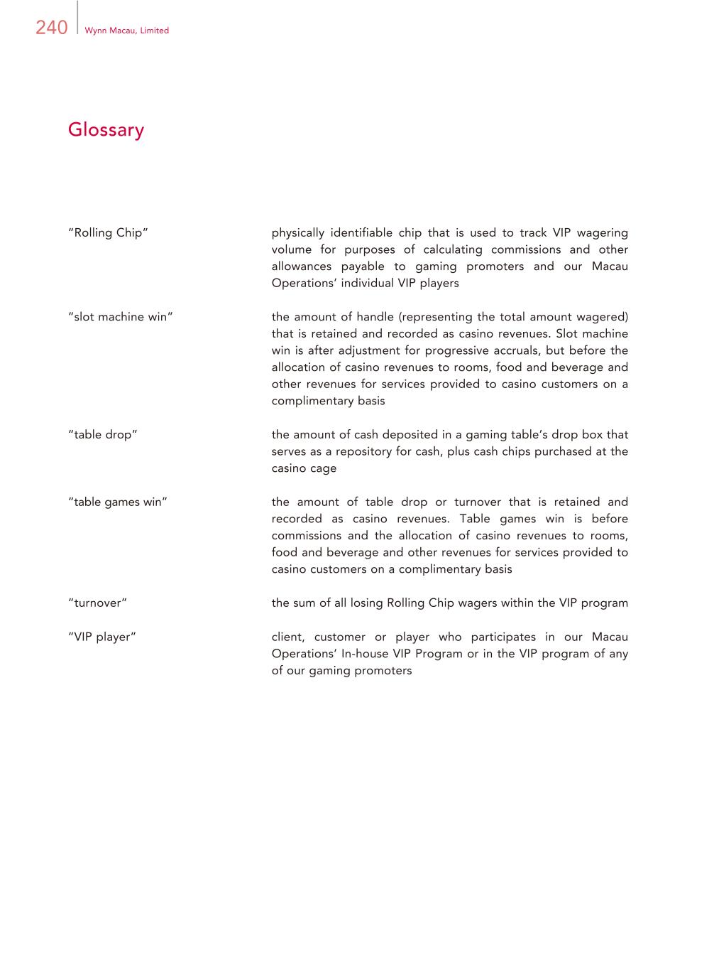 240 Wynn Macau, Limited Glossary “Rolling Chip” physically identifiable chip that is used to track VIP wagering volume for purposes of calculating commissions and other allowances payable to gaming promoters and our Macau Operations’ individual VIP players “slot machine win” the amount of handle (representing the total amount wagered) that is retained and recorded as casino revenues. Slot machine win is after adjustment for progressive accruals, but before the allocation of casino revenues to rooms, food and beverage and other revenues for services provided to casino customers on a complimentary basis “table drop” the amount of cash deposited in a gaming table’s drop box that serves as a repository for cash, plus cash chips purchased at the casino cage “table games win” the amount of table drop or turnover that is retained and recorded as casino revenues. Table games win is before commissions and the allocation of casino revenues to rooms, food and beverage and other revenues for services provided to casino customers on a complimentary basis “turnover” the sum of all losing Rolling Chip wagers within the VIP program “VIP player” client, customer or player who participates in our Macau Operations’ In-house VIP Program or in the VIP program of any of our gaming promoters