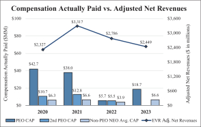| ✓ | NEO Compensation Reflects our Performance. Our NEO compensation is closely aligned with our performance in 2023, while giving appropriate consideration to our operating results. In a challenging operating environment where global announced M&A activity based on deal value was down almost 20%, we delivered solid results under the prevailing market conditions, while accomplishing important strategic objectives, including the recruitment of our largest class ever of Advisory senior managing directors and the expansion of our client relationships and coverage universe. However, our Adjusted Net Revenues* declined to approximately $2.4 billion, Adjusted EPS* declined to approximately $6.46 and Adjusted Net Income* declined to approximately $276.9 million. Accordingly, our CEO’s compensation declined in 2023 compared to 2022, on top of the 41% decrease in our CEO’s annual incentive award from 2021 to 2022. |