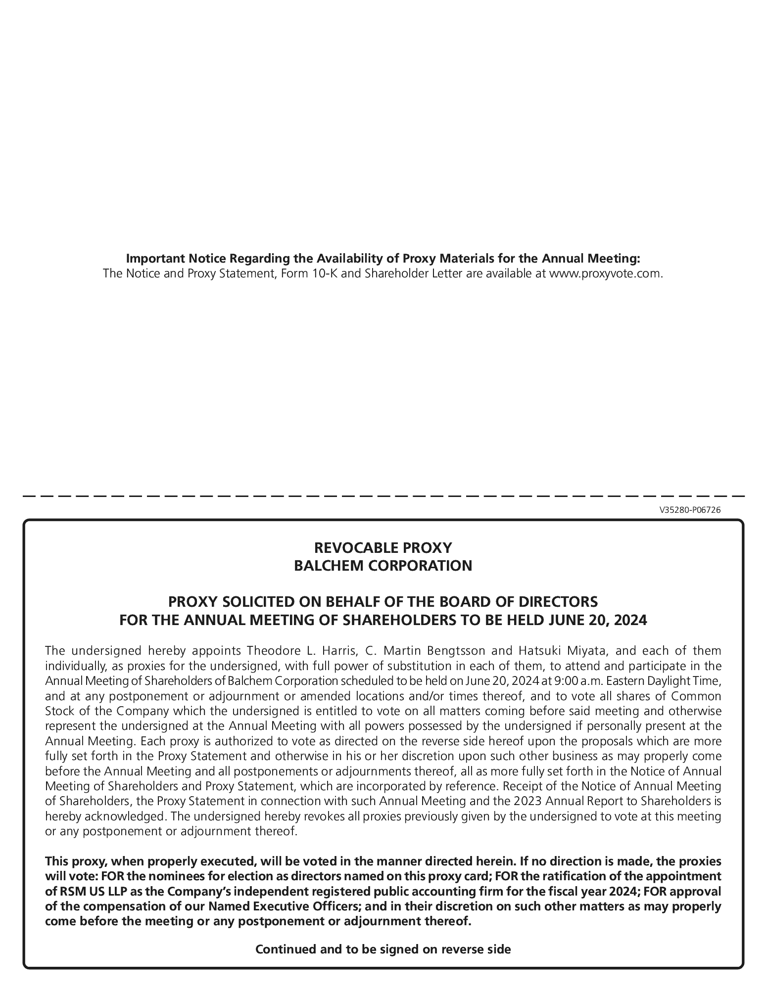 The enclosed 2024 Proxy Statement and Notice of Annual Meeting describe the items of business that we will conduct at the meeting and provide you with important information about Balchem, including our practices in the areas of corporate governance and executive compensation. We strongly encourage you to read these materials and then vote your shares.