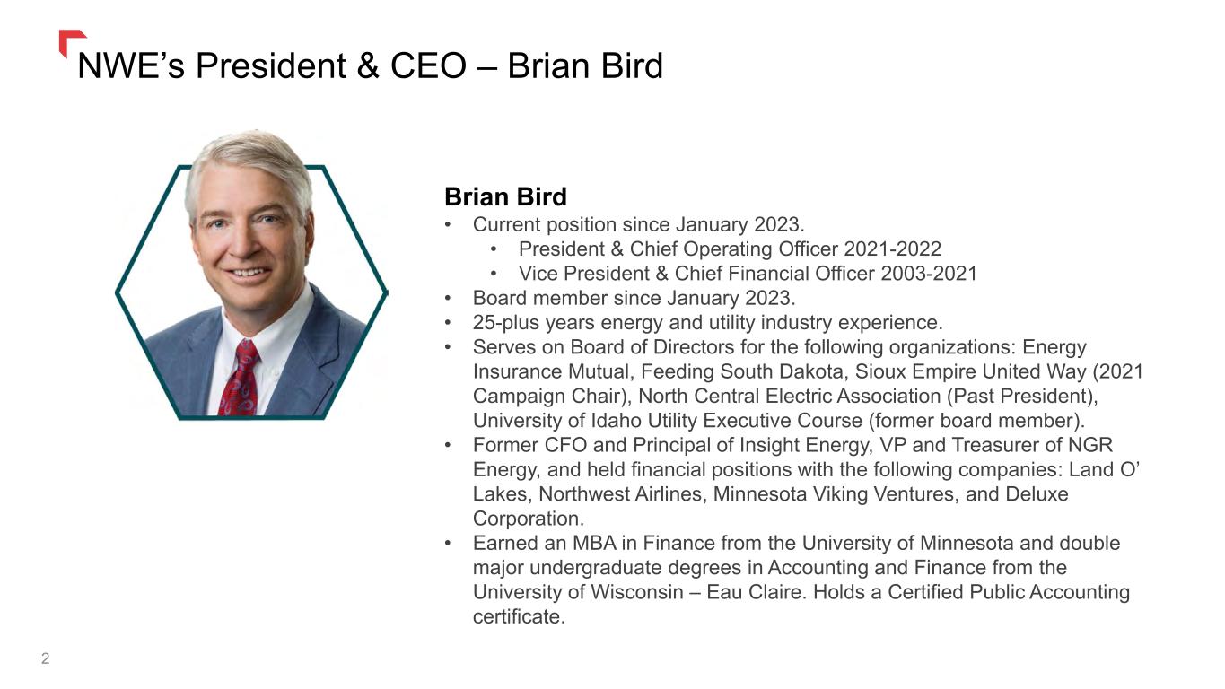 NWE’s President & CEO – Brian Bird 2 Brian Bird • Current position since January 2023. • President & Chief Operating Officer 2021-2022 • Vice President & Chief Financial Officer 2003-2021 • Board member since January 2023. • 25-plus years energy and utility industry experience. • Serves on Board of Directors for the following organizations: Energy Insurance Mutual, Feeding South Dakota, Sioux Empire United Way (2021 Campaign Chair), North Central Electric Association (Past President), University of Idaho Utility Executive Course (former board member). • Former CFO and Principal of Insight Energy, VP and Treasurer of NGR Energy, and held financial positions with the following companies: Land O’ Lakes, Northwest Airlines, Minnesota Viking Ventures, and Deluxe Corporation. • Earned an MBA in Finance from the University of Minnesota and double major undergraduate degrees in Accounting and Finance from the University of Wisconsin – Eau Claire. Holds a Certified Public Accounting certificate.