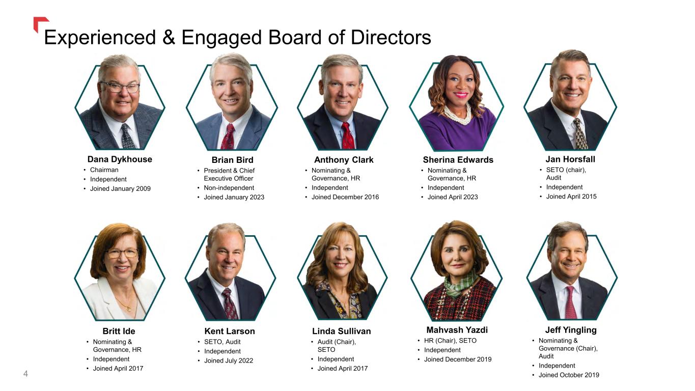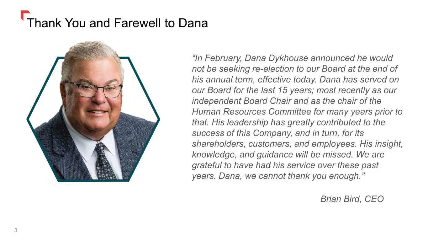 Thank You and Farewell to Dana 3 “In February, Dana Dykhouse announced he would not be seeking re-election to our Board at the end of his annual term, effective today. Dana has served on our Board for the last 15 years; most recently as our independent Board Chair and as the chair of the Human Resources Committee for many years prior to that. His leadership has greatly contributed to the success of this Company, and in turn, for its shareholders, customers, and employees. His insight, knowledge, and guidance will be missed. We are grateful to have had his service over these past years. Dana, we cannot thank you enough.” Brian Bird, CEO