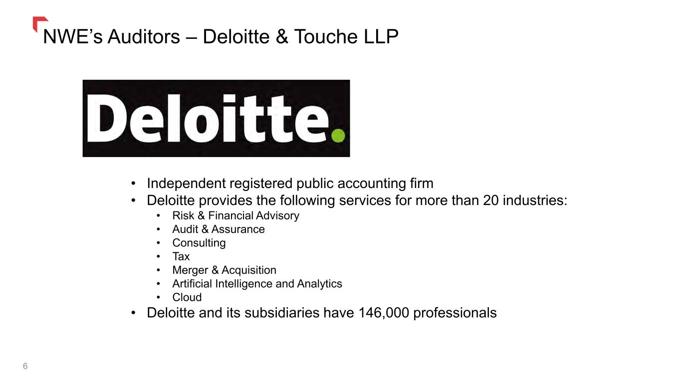 NWE’s Auditors – Deloitte & Touche LLP 6 • Independent registered public accounting firm • Deloitte provides the following services for more than 20 industries: • Risk & Financial Advisory • Audit & Assurance • Consulting • Tax • Merger & Acquisition • Artificial Intelligence and Analytics • Cloud • Deloitte and its subsidiaries have 146,000 professionals