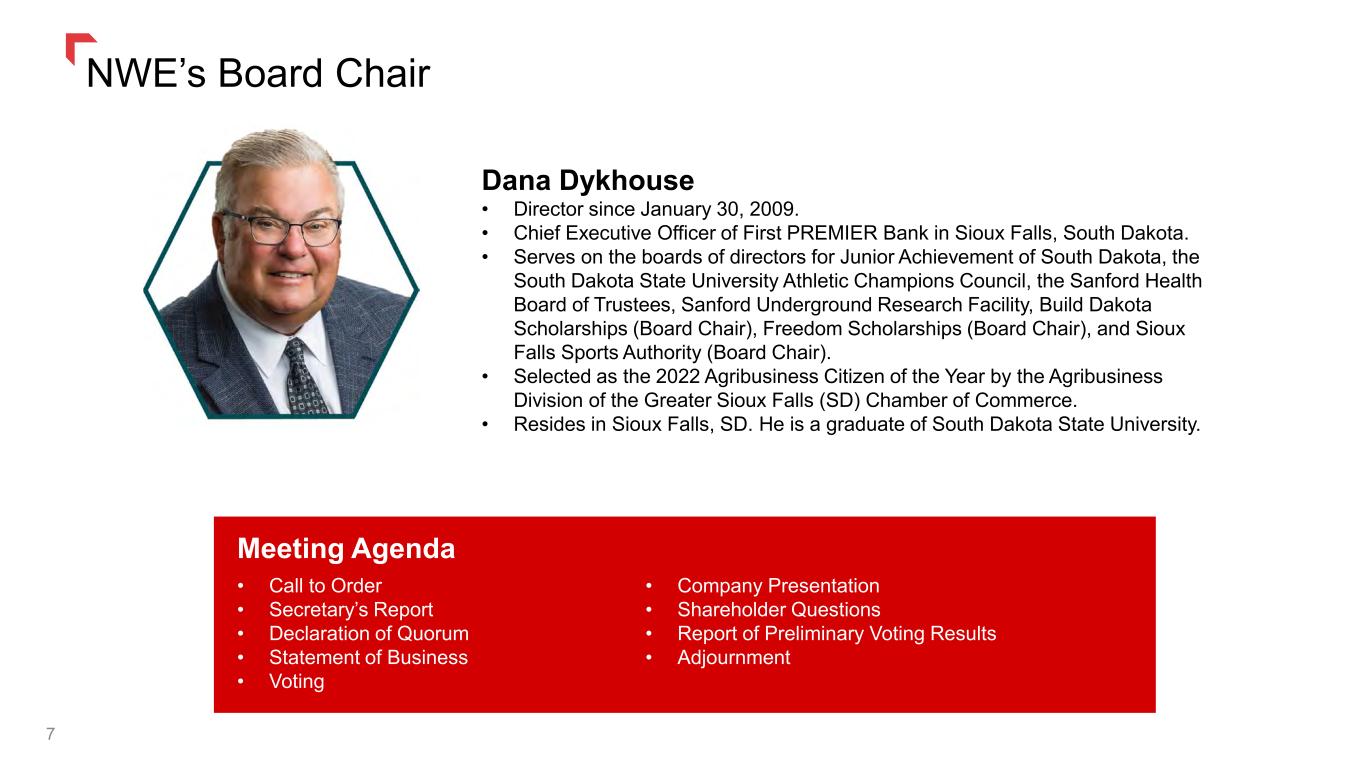 The Annual Meeting will be webcast live and can be accessed by visiting www.virtualshareholdermeeting.com/NWE2024 To participate in the meeting, please go to the site at least 10 minutes in advance of the meeting and follow the check-in procedures.