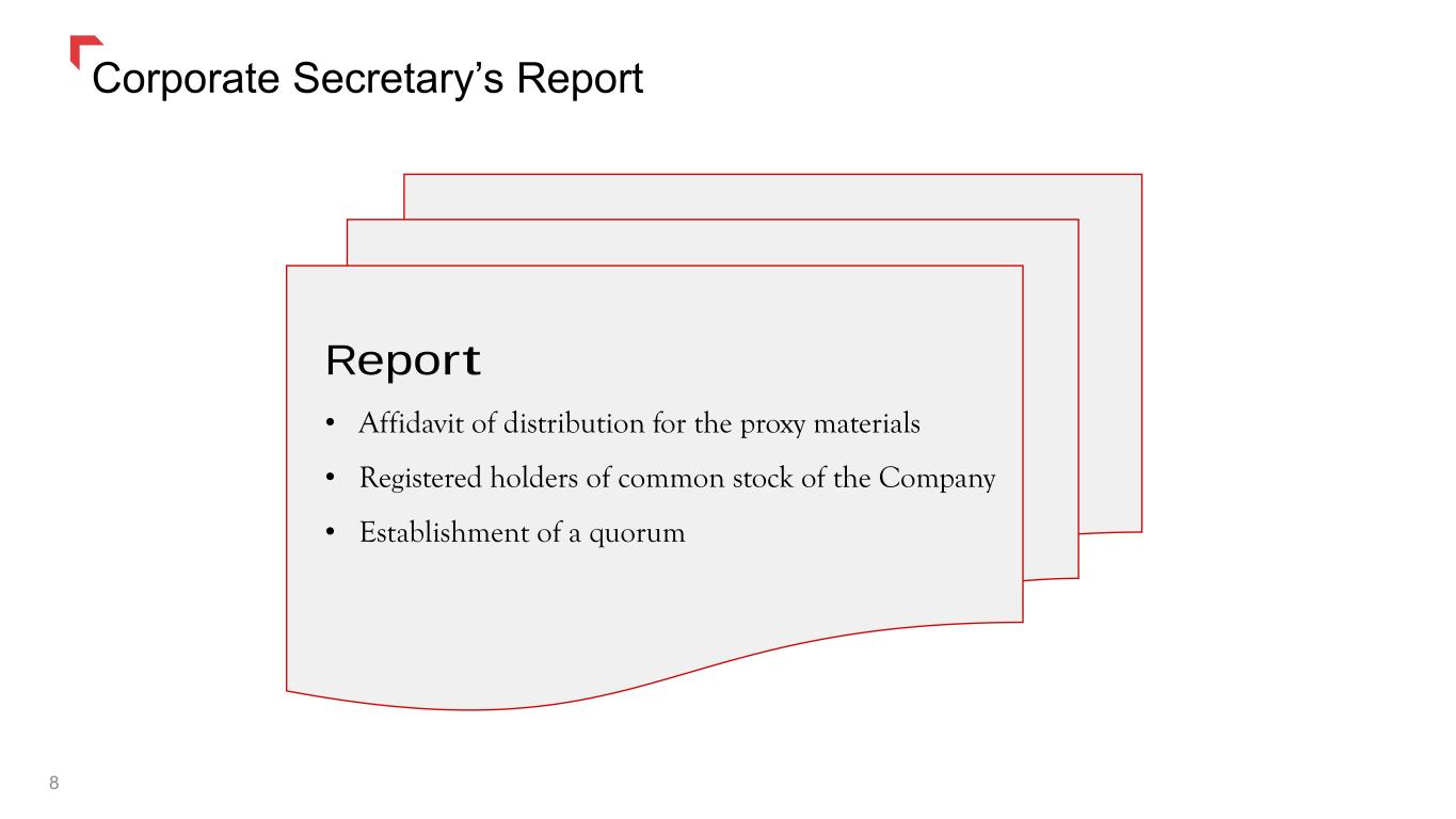 Corporate Secretary’s Report 8 Report • Affidavit of distribution for the proxy materials • Registered holders of common stock of the Company • Establishment of a quorum