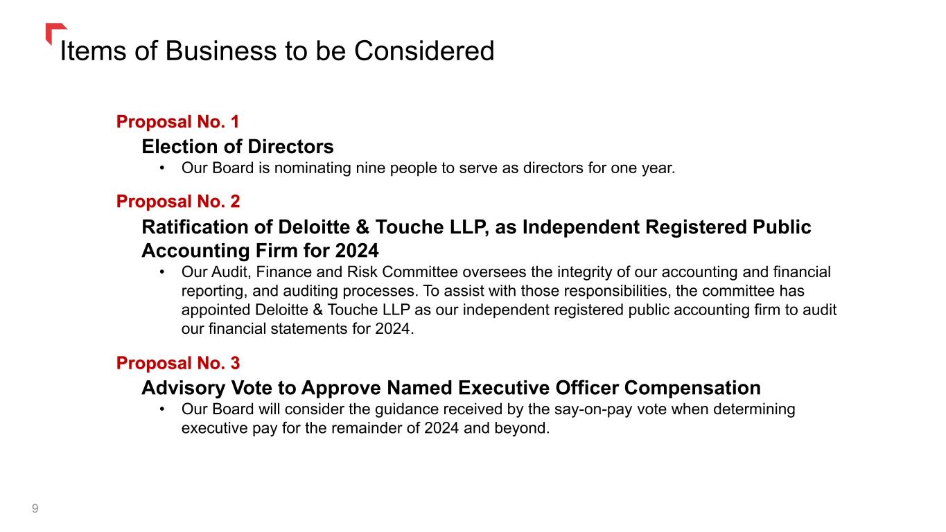 Items of Business to be Considered 9 Election of Directors • Our Board is nominating nine people to serve as directors for one year. Ratification of Deloitte & Touche LLP, as Independent Registered Public Accounting Firm for 2024 • Our Audit, Finance and Risk Committee oversees the integrity of our accounting and financial reporting, and auditing processes. To assist with those responsibilities, the committee has appointed Deloitte & Touche LLP as our independent registered public accounting firm to audit our financial statements for 2024. Advisory Vote to Approve Named Executive Officer Compensation • Our Board will consider the guidance received by the say-on-pay vote when determining executive pay for the remainder of 2024 and beyond. Proposal No. 1 Proposal No. 2 Proposal No. 3
