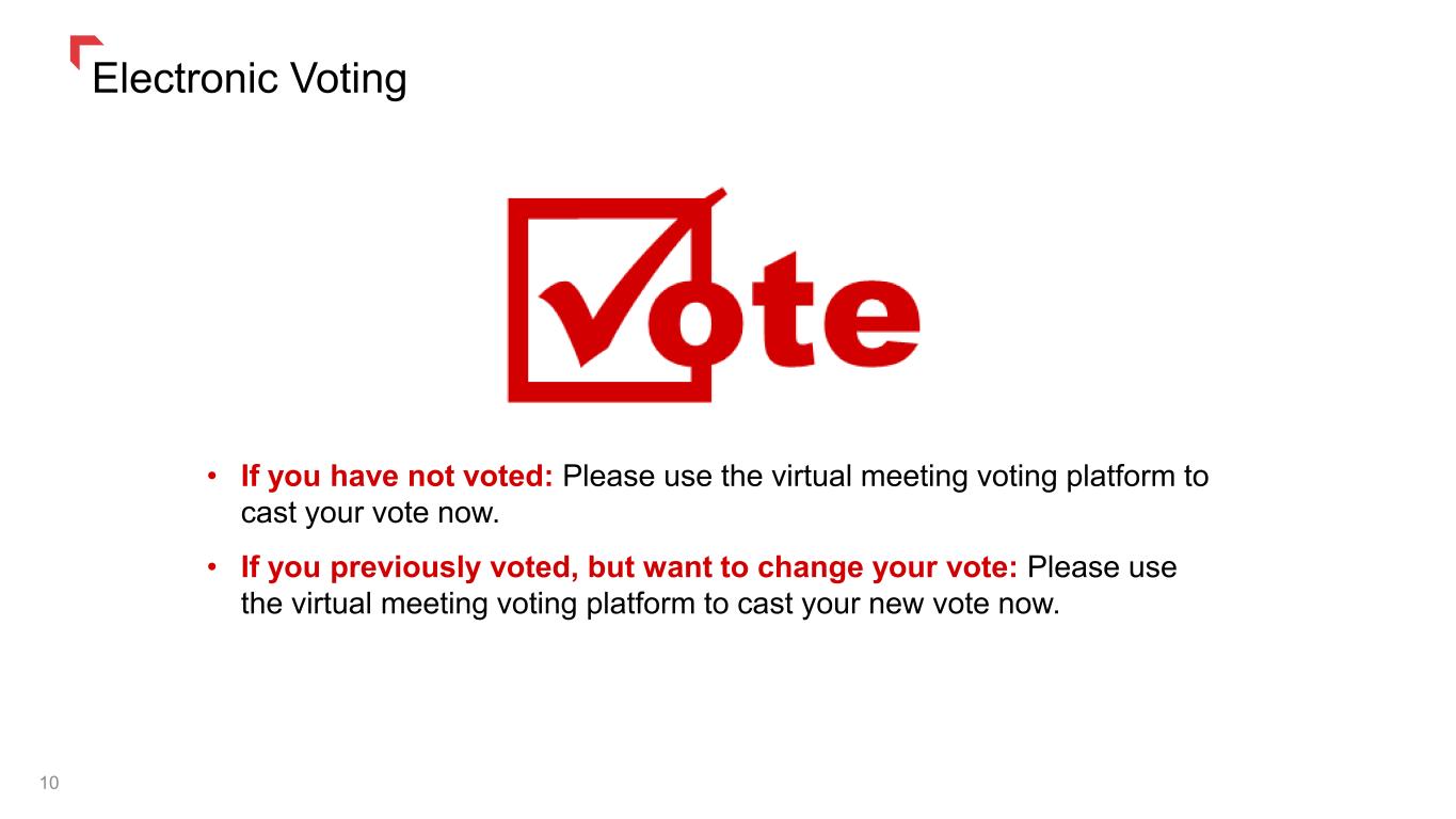 Electronic Voting 10 • If you have not voted: Please use the virtual meeting voting platform to cast your vote now. • If you previously voted, but want to change your vote: Please use the virtual meeting voting platform to cast your new vote now.