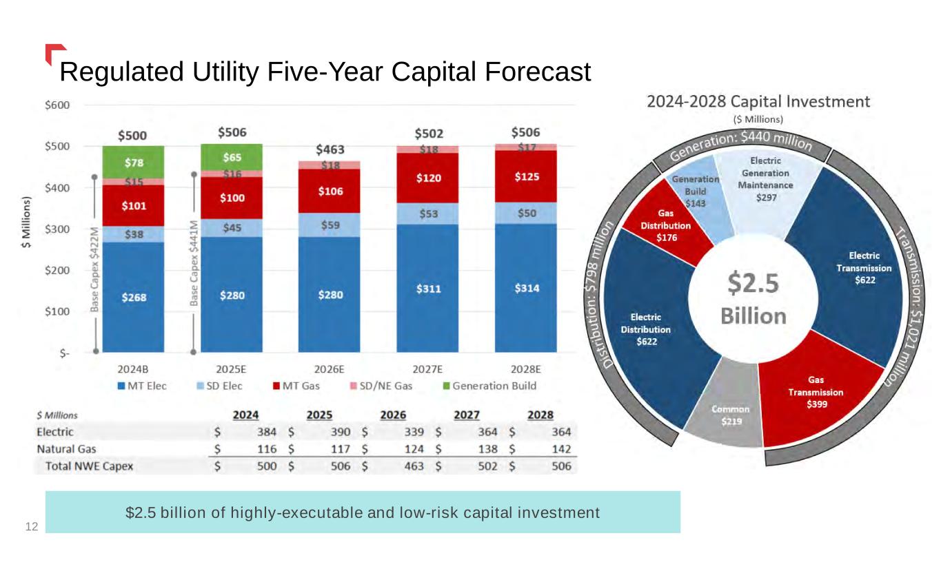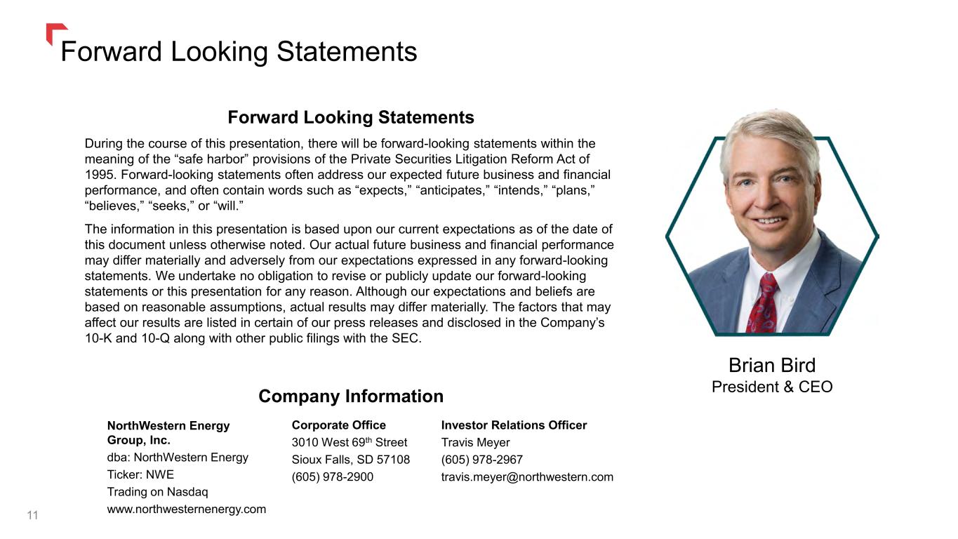 Forward Looking Statements 11 Forward Looking Statements During the course of this presentation, there will be forward-looking statements within the meaning of the “safe harbor” provisions of the Private Securities Litigation Reform Act of 1995. Forward-looking statements often address our expected future business and financial performance, and often contain words such as “expects,” “anticipates,” “intends,” “plans,” “believes,” “seeks,” or “will.” The information in this presentation is based upon our current expectations as of the date of this document unless otherwise noted. Our actual future business and financial performance may differ materially and adversely from our expectations expressed in any forward-looking statements. We undertake no obligation to revise or publicly update our forward-looking statements or this presentation for any reason. Although our expectations and beliefs are based on reasonable assumptions, actual results may differ materially. The factors that may affect our results are listed in certain of our press releases and disclosed in the Company’s 10-K and 10-Q along with other public filings with the SEC. NorthWestern Energy Group, Inc. dba: NorthWestern Energy Ticker: NWE Trading on Nasdaq www.northwesternenergy.com Corporate Office 3010 West 69th Street Sioux Falls, SD 57108 (605) 978-2900 Investor Relations Officer Travis Meyer (605) 978-2967 travis.meyer@northwestern.com Company Information Brian Bird President & CEO