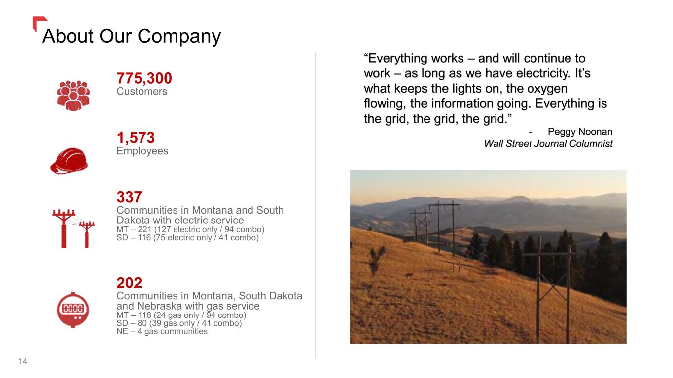 NWE – An Investment for the Long Term 13 • Approved Montana electric & natural gas and South Dakota electric rate reviews aid earnings, cash flow, and balance sheet strength • History of consistent annual dividend growth • 100% pure electric & natural gas utility with over 100 years of operating history • Solid economic indicators in service territory • Diverse electric supply portfolio ~55% hydro, wind & solar Pure Electric & Gas Utility Solid Utility Foundation Earnings & Cash Flow Attractive Future Growth Prospects Financial Goals & Metrics Best Practices Corporate Governance • Residential electric & gas rates below national average • Solid system reliability • Low leaks per 100 miles of pipe • Solid JD Power Overall Customer Satisfaction scores • Disciplined maintenance capital investment program focus on reliability, capacity, asset life and compliance • Further opportunity for energy supply investment to meet significant capacity shortfalls • Target 4%-6% EPS growth plus dividend yield to provide competitive total return • Target dividend long-term payout ratio of 60%-70% • Target debt to capitalization ratio of 50%-55% with liquidity of $100 million or greater 5th Best Governance Score Recognized as one of America’s Greatest Workplaces