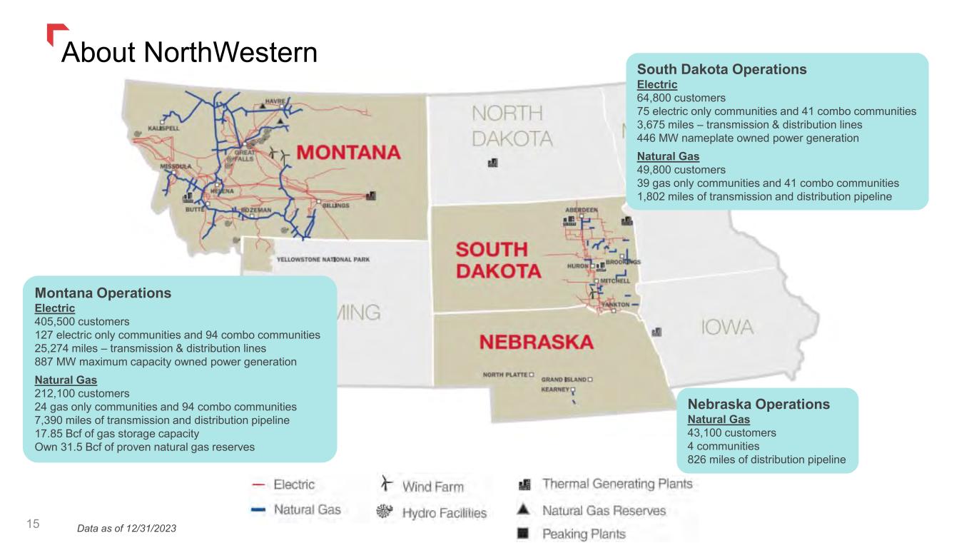 About Our Company 14 775,300 Customers 1,573 Employees 337 Communities in Montana and South Dakota with electric service MT – 221 (127 electric only / 94 combo) SD – 116 (75 electric only / 41 combo) 202 Communities in Montana, South Dakota and Nebraska with gas service MT – 118 (24 gas only / 94 combo) SD – 80 (39 gas only / 41 combo) NE – 4 gas communities “Everything works – and will continue to work – as long as we have electricity. It’s what keeps the lights on, the oxygen flowing, the information going. Everything is the grid, the grid, the grid.” - Peggy Noonan Wall Street Journal Columnist