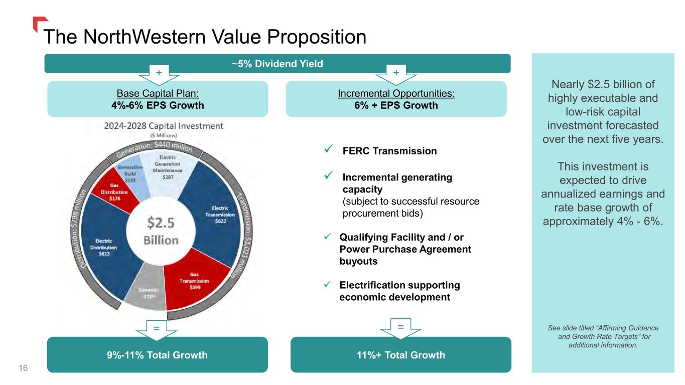 About NorthWestern 15 Montana Operations Electric 405,500 customers 127 electric only communities and 94 combo communities 25,274 miles – transmission & distribution lines 887 MW maximum capacity owned power generation Natural Gas 212,100 customers 24 gas only communities and 94 combo communities 7,390 miles of transmission and distribution pipeline 17.85 Bcf of gas storage capacity Own 31.5 Bcf of proven natural gas reserves Nebraska Operations Natural Gas 43,100 customers 4 communities 826 miles of distribution pipeline Data as of 12/31/2023 South Dakota Operations Electric 64,800 customers 75 electric only communities and 41 combo communities 3,675 miles – transmission & distribution lines 446 MW nameplate owned power generation Natural Gas 49,800 customers 39 gas only communities and 41 combo communities 1,802 miles of transmission and distribution pipeline