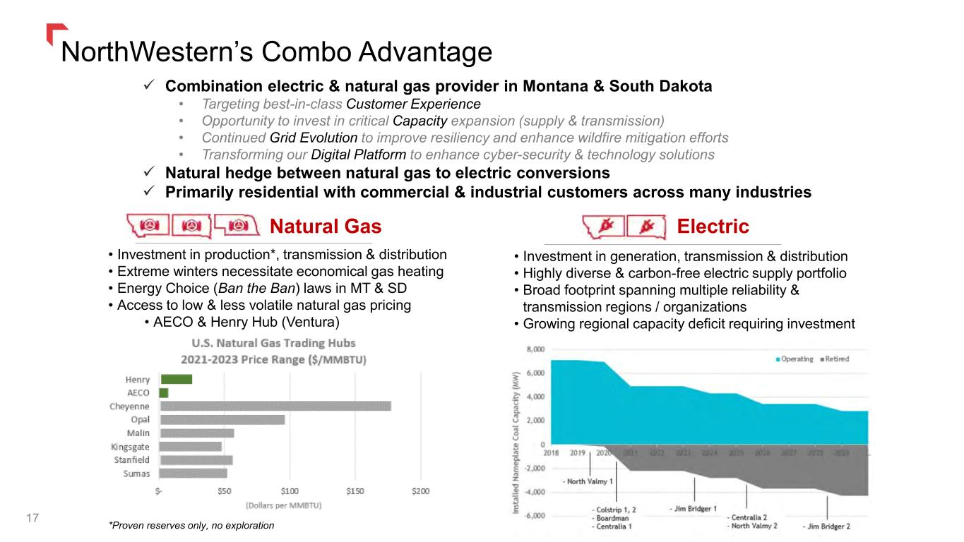 9%-11% Total Growth 11%+ Total Growth Incremental Opportunities: 6% + EPS Growth ~5% Dividend Yield Base Capital Plan: 4%-6% EPS Growth FERC Transmission Incremental generating capacity (subject to successful resource procurement bids) Qualifying Facility and / or Power Purchase Agreement buyouts Electrification supporting economic development Nearly $2.5 billion of highly executable and low-risk capital investment forecasted over the next five years. This investment is expected to drive annualized earnings and rate base growth of approximately 4% - 6%. See slide titled “Affirming Guidance and Growth Rate Targets” for additional information. + The NorthWestern Value Proposition + 16 = =
