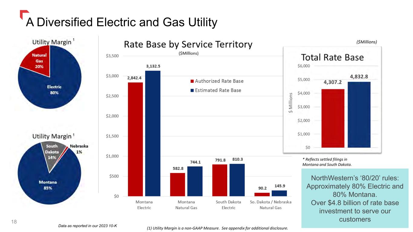 NorthWestern’s Combo Advantage 17 • Investment in production*, transmission & distribution • Extreme winters necessitate economical gas heating • Energy Choice (Ban the Ban) laws in MT & SD • Access to low & less volatile natural gas pricing • AECO & Henry Hub (Ventura) *Proven reserves only, no exploration Combination electric & natural gas provider in Montana & South Dakota • Targeting best-in-class Customer Experience • Opportunity to invest in critical Capacity expansion (supply & transmission) • Continued Grid Evolution to improve resiliency and enhance wildfire mitigation efforts • Transforming our Digital Platform to enhance cyber-security & technology solutions Natural hedge between natural gas to electric conversions Primarily residential with commercial & industrial customers across many industries • Investment in generation, transmission & distribution • Highly diverse & carbon-free electric supply portfolio • Broad footprint spanning multiple reliability & transmission regions / organizations • Growing regional capacity deficit requiring investment ElectricNatural Gas