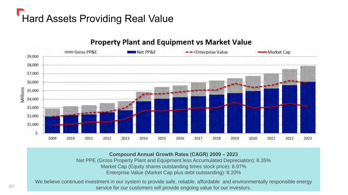 Hard Assets Providing Real Value 21 Compound Annual Growth Rates (CAGR) 2009 – 2023 Net PPE (Gross Property Plant and Equipment less Accumulated Depreciation): 8.35% Market Cap (Equity shares outstanding times stock price): 8.97% Enterprise Value (Market Cap plus debt outstanding): 8.20% We believe continued investment in our system to provide safe, reliable, affordable and environmentally responsible energy service for our customers will provide ongoing value for our investors.