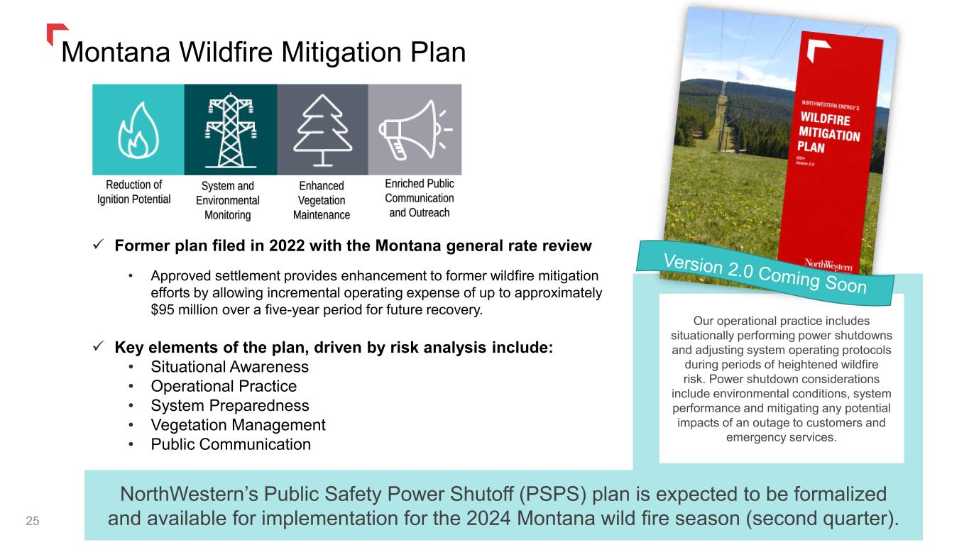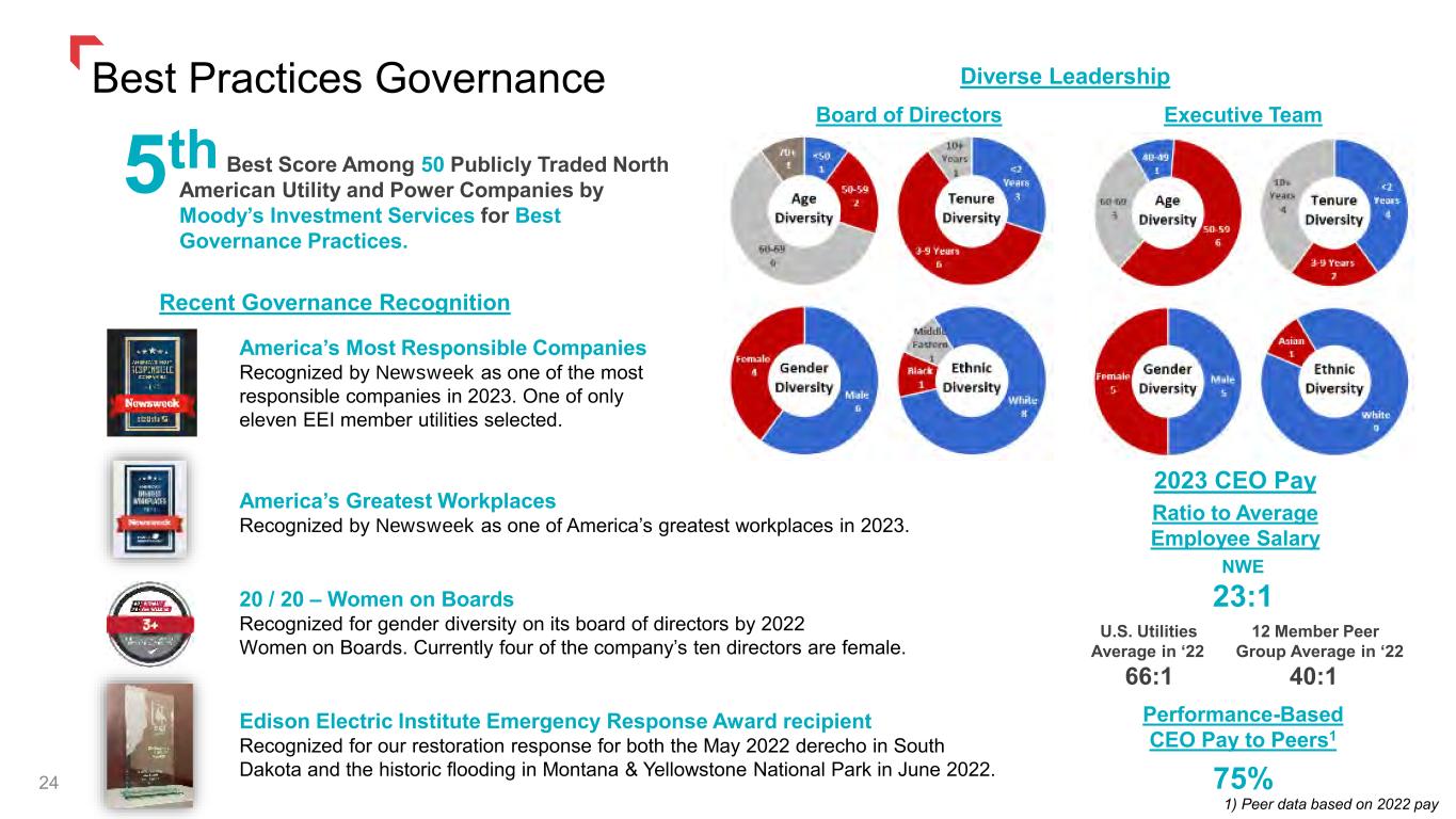 Best Practices Governance 24 America’s Most Responsible Companies Recognized by Newsweek as one of the most responsible companies in 2023. One of only eleven EEI member utilities selected. Board of Directors Executive Team 5th Best Score Among 50 Publicly Traded North American Utility and Power Companies by Moody’s Investment Services for Best Governance Practices. Diverse Leadership 2023 CEO Pay Ratio to Average Employee Salary NWE 23:1 U.S. Utilities 12 Member Peer Average in ‘22 Group Average in ‘22 66:1 40:1 Performance-Based CEO Pay to Peers1 75% Recent Governance Recognition America’s Greatest Workplaces Recognized by Newsweek as one of America’s greatest workplaces in 2023. 20 / 20 – Women on Boards Recognized for gender diversity on its board of directors by 2022 Women on Boards. Currently four of the company’s ten directors are female. Edison Electric Institute Emergency Response Award recipient Recognized for our restoration response for both the May 2022 derecho in South Dakota and the historic flooding in Montana & Yellowstone National Park in June 2022. 1) Peer data based on 2022 pay
