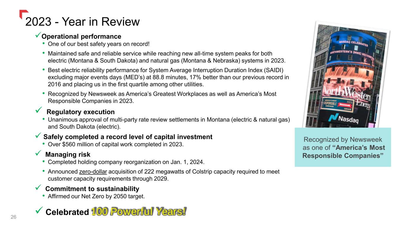 Montana Wildfire Mitigation Plan 25 Reduction of Ignition Potential System and Environmental Monitoring Enhanced Vegetation Maintenance Enriched Public Communication and Outreach Former plan filed in 2022 with the Montana general rate review • Approved settlement provides enhancement to former wildfire mitigation efforts by allowing incremental operating expense of up to approximately $95 million over a five-year period for future recovery. Key elements of the plan, driven by risk analysis include: • Situational Awareness • Operational Practice • System Preparedness • Vegetation Management • Public Communication NorthWestern’s Public Safety Power Shutoff (PSPS) plan is expected to be formalized and available for implementation for the 2024 Montana wild fire season (second quarter). Our operational practice includes situationally performing power shutdowns and adjusting system operating protocols during periods of heightened wildfire risk. Power shutdown considerations include environmental conditions, system performance and mitigating any potential impacts of an outage to customers and emergency services.